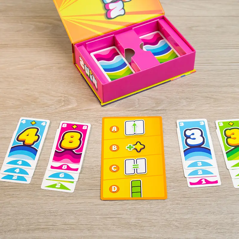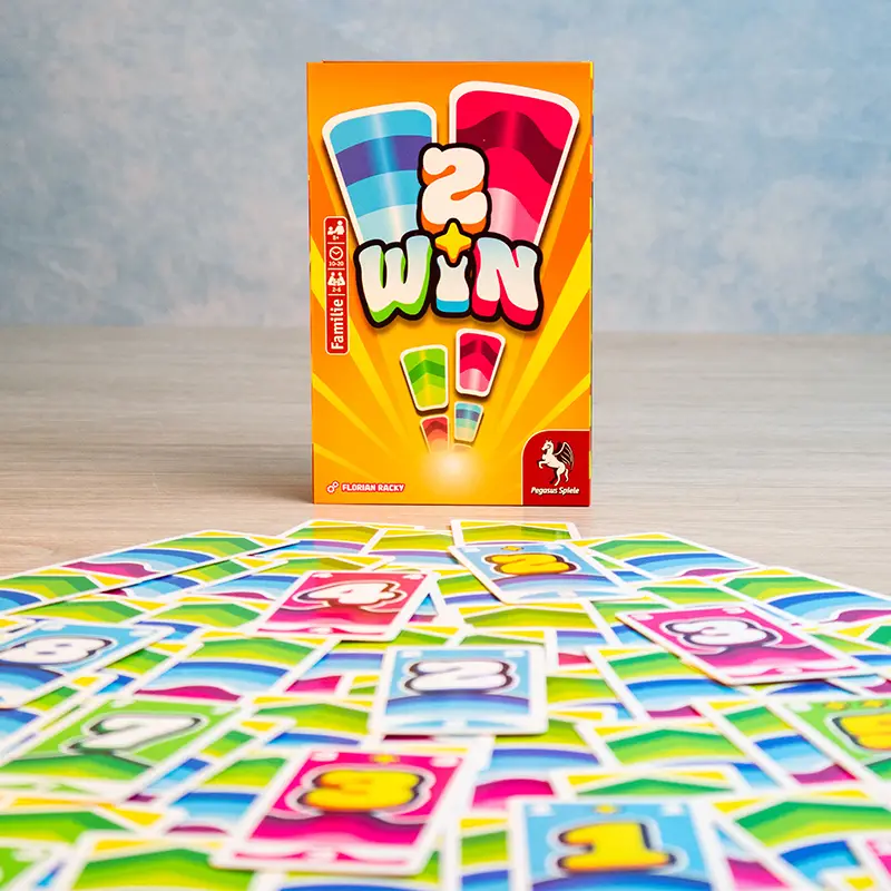 In 2 Win spielen alle gleichzeitig zwei Zahlenkarten von ihrer Hand aus, sodass vor allen je eine zweistellige Zahl ausliegt. In jeder Runde wiederholt sich das Prozedere, nun müssen die Karten aber einen höheren Zahlenwert ergeben als in der Runde zuvor. Neue Karten gibt es nur dann, wenn bestimmte Voraussetzungen erfüllt werden. Wer z.B. drei Mal hintereinander dieselbe Farbe in einer Spalte oder einen Pasch ausspielt, erhält ebenso eine neue Karte wie die Person, die in dieser Runde die höchste Zahl oder die meisten Sterne ausliegen hat. Wer nichts mehr ausspielen kann, ist raus, wer dagegen am längsten im Spiel bleibt, gewinnt!