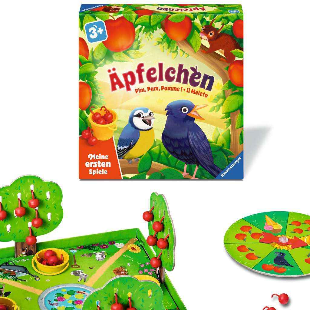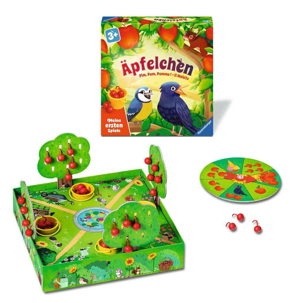 "Bei dem Kinderspiel Äpfelchen lautet das Motto: Äpfel pflücken und Eimer füllen. Jedes Kind hat im Garten ein eigenes Apfelbäumchen. Jetzt sind die Äpfel reif und die Ernte kann beginnen. Doch aufgepasst, man darf sich nicht vom frechen Raben oder dem leckeren Eis ablenken lassen! Das Brettspiel fördert spielerisch das erste Regelverständnis, die Wahrnehmung und erstes Zählen."