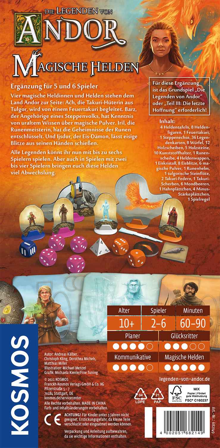 Unterstützung für Andor! Vier neue magische Held*innen helfen bei der Verteidigung Andors. Die Spieler*innen schlüpfen in ihre Rollen und bestimmen mit ihren einzigartigen Fähigkeiten den weiteren Fortgang der Legenden. Aæh, die Hüterin der mythischen Feuer-Takuri; Baz, der Wüstennomade; Iril, die Runenmeisterin und Ijsdur, der Eis-Dämon. Mit diesen vier Held*innen können alle Legenden mit bis zu sechs Spielern*innen gespielt werden. Aber auch in Spielen mit zwei bis vier Spieler*innen bringen sie euch viel Abwechslung.