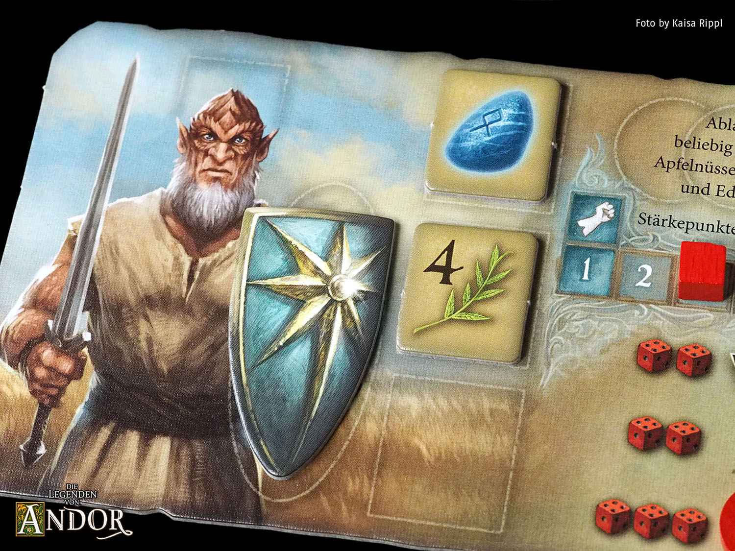 Inhalt: | 4 Heldentafeln 10 Würfel 12 Figuren in Kunststoffhalter 36 Legendenkarten 8 Holzscheiben 4 Holzsteine Stanzteile 8 Klebepunkte 1 Spielregel (DE) |