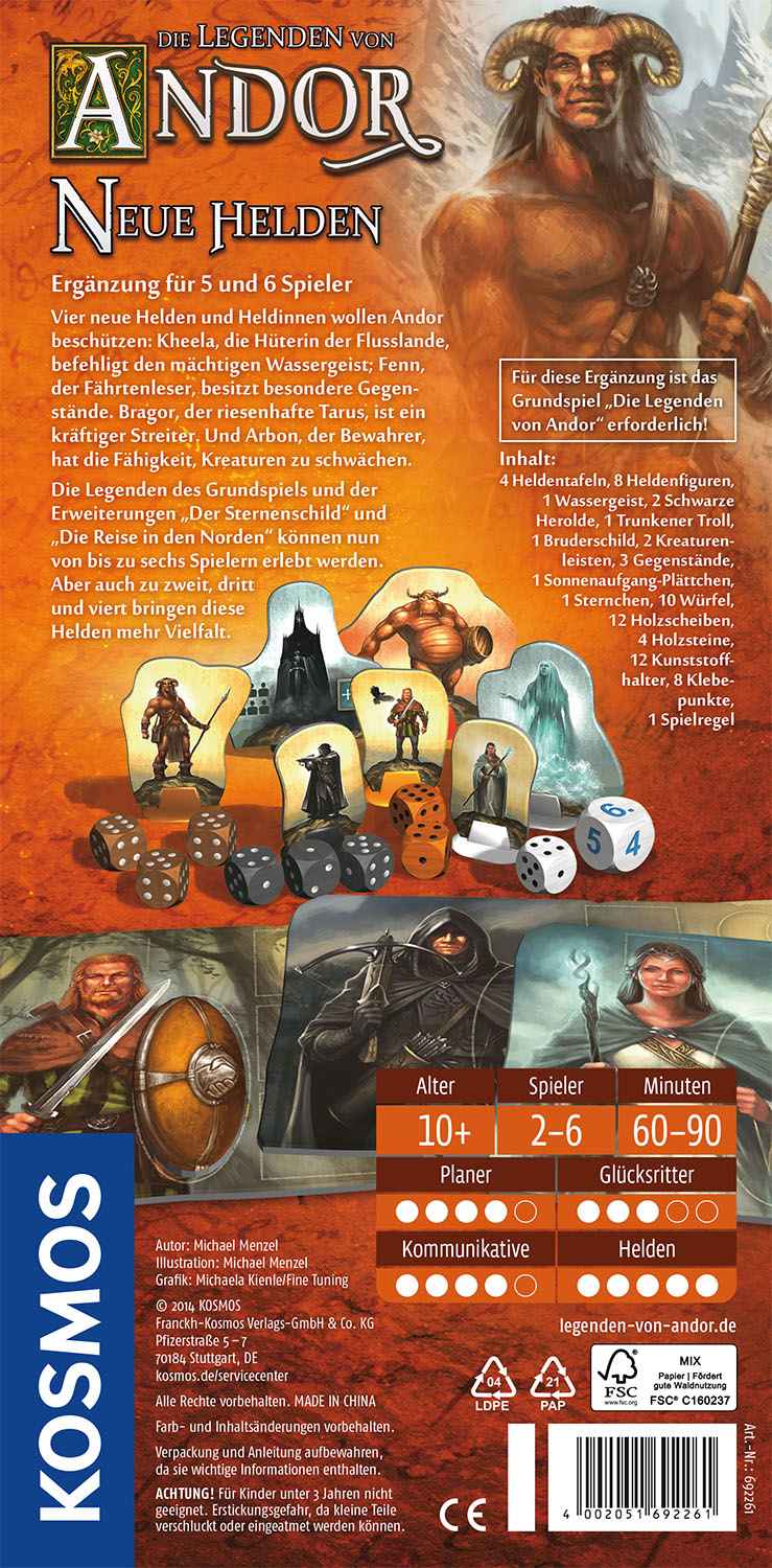 Ergänzung für 5–6 Spieler: Vier neue Helden stehen zur Auswahl, mit denen sich alle Legenden des Grundspiels und der Erweiterung „Der Sternenschild“ nun auch zu fünft oder sechst spielen lassen. Aber auch bei Runden mit zwei bis vier Spielern können die neuen Helden zum Einsatz kommen und für mehr Spannung und Abwechslung sorgen.