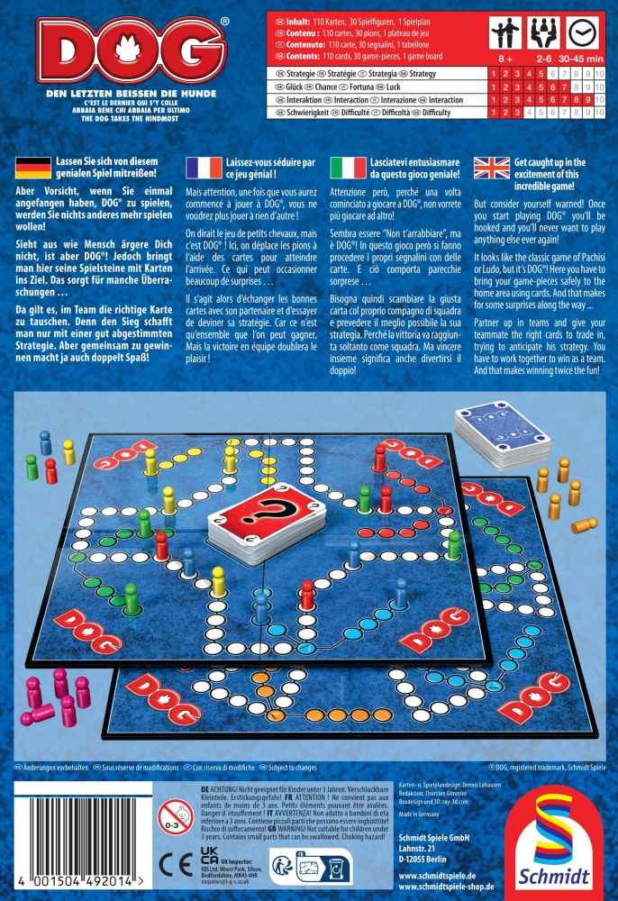 Sieht aus wie Mensch ärgere Dich nicht, ist aber Dog! Das Einzige was gleich ist, ist, dass man seine vier Spielsteine sicher in sein Häuschen bringen muss. Allerdings bewegt man sie mit Karten vorwärts, die so manche Überraschung parat halten können.