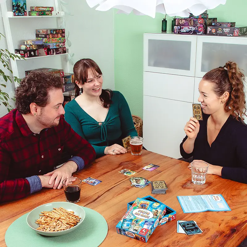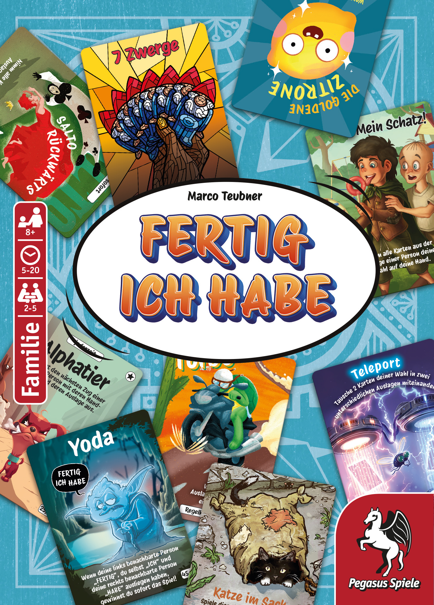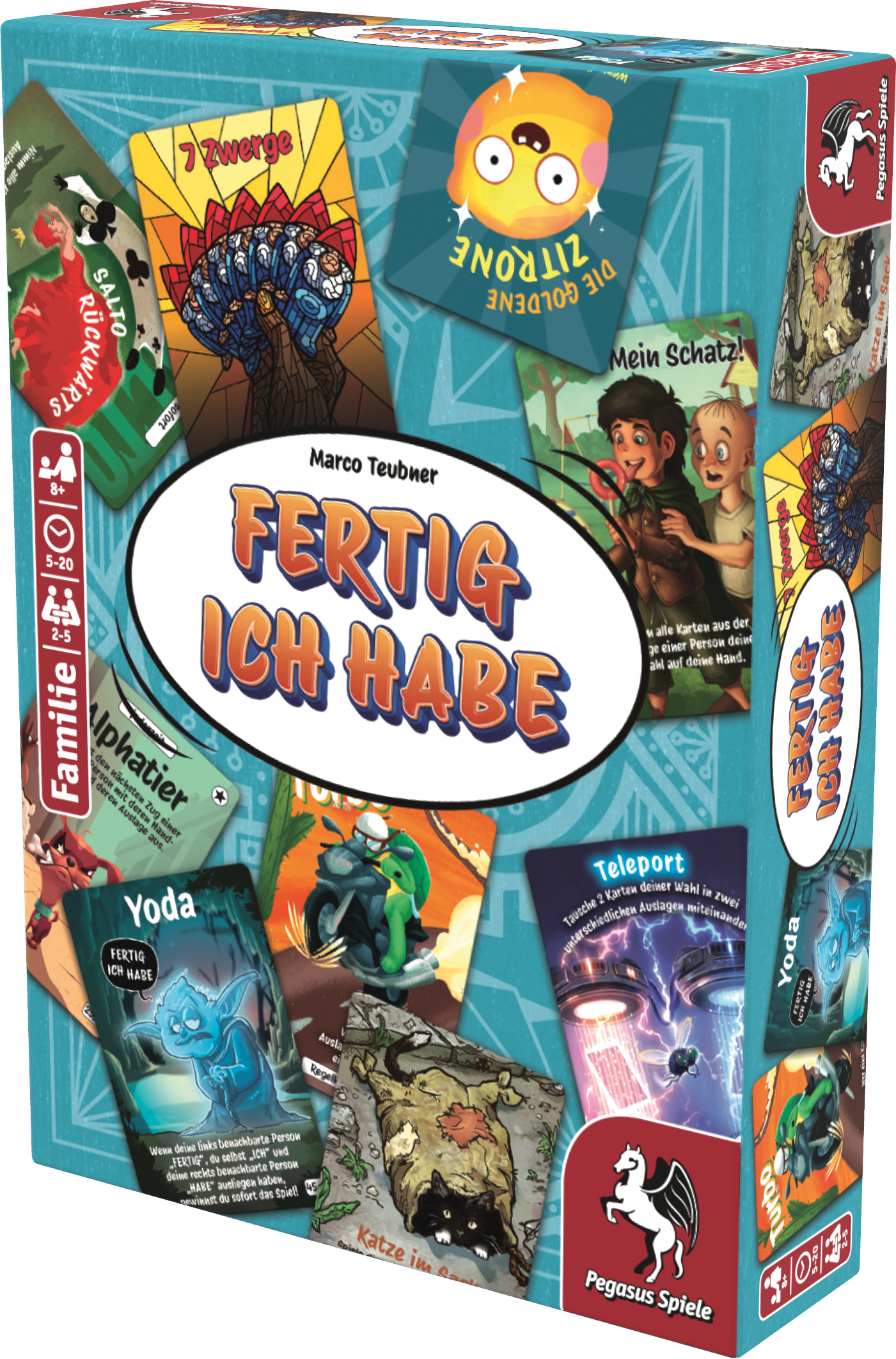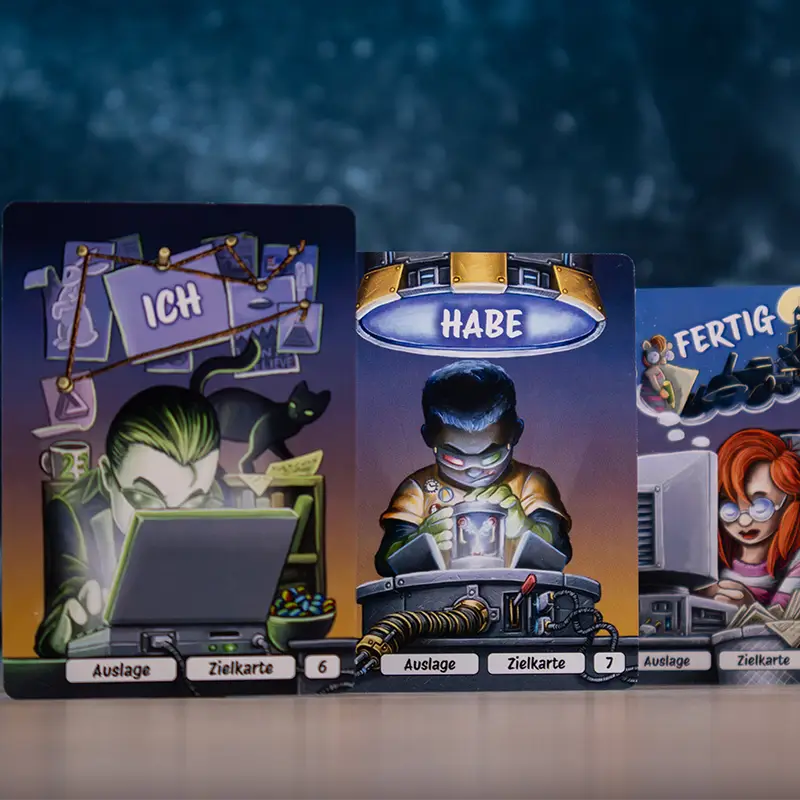 Das Spielprinzip ist leicht erklärt: Wer am Zug ist, darf entweder eine Karte vom Nachziehstapel auf die Hand nehmen oder eine Handkarte ausspielen und tun, was die Karte verlangt. Gespielt wird im Uhrzeigersinn und wer gewinnen will, muss als erstes die drei Zielkarten „FERTIG“, „ICH“ und „HABE“ vor sich ausliegen haben. Aber die Spielanleitung gilt hier eher als Richtlinie: Was passiert, entscheiden die chaotischen Karten. Zum Beispiel sorgt das „Müllrad“ dafür, dass der Ablagestapel in den Nachziehstapel gemischt wird und zwei Karten nachgezogen werden. Oder es folgt eine „Überraschung“, ein „Befehl von ganz, ganz oben“ oder „Schrödingers Albtraum“, was das Spiel ganz schön aufmischen kann … 83 neue Spielkarten, illustriert von 35 Künstler*innen sorgen für noch mehr Wendungen und noch mehr Blödsinn.