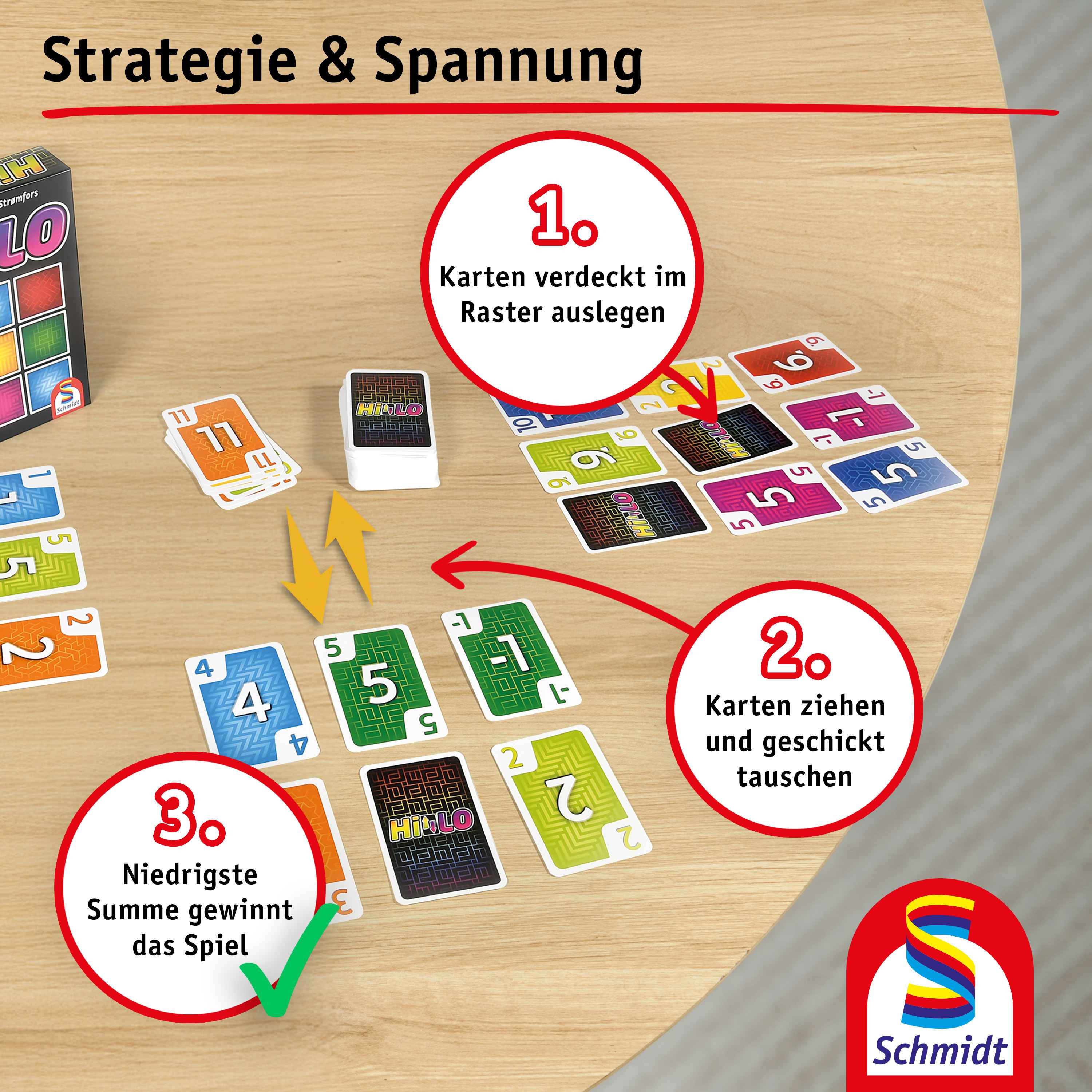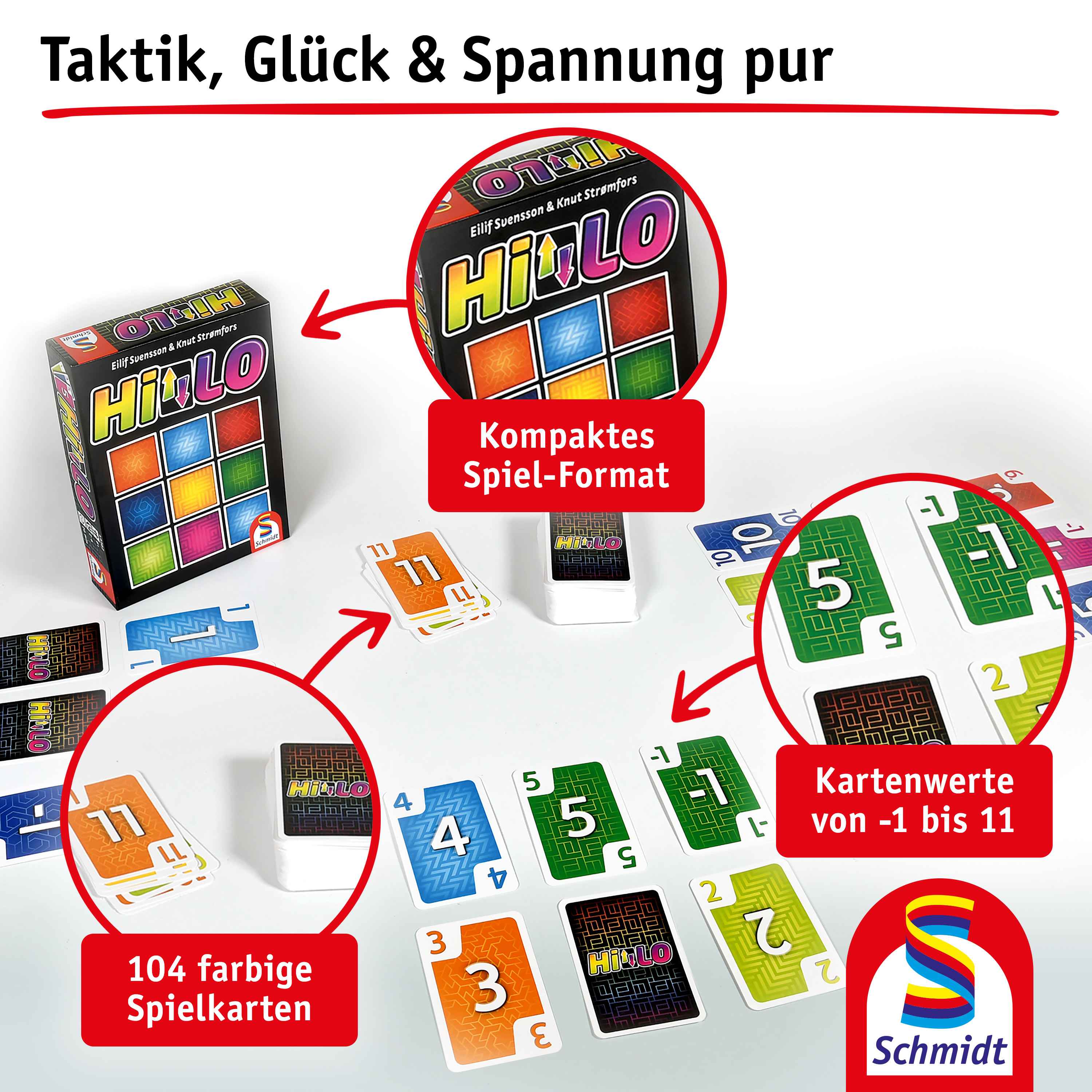 HILO ist schnell erklärt und schnell gespielt! Und das mehrmals hintereinander. Garantiert! Versuche so schnell wie möglich hohe Karten in deiner Auslage durch niedrigere Karten zu ersetzen oder ganze Reihen zu entfernen. Denn der Spieler mit den wenigsten Punkten gewinnt. Hat aber ein Mitspieler alle Karten aufgedeckt, endet die Spielrunde. HILO ist das Spiel mit Suchtcharakter!
