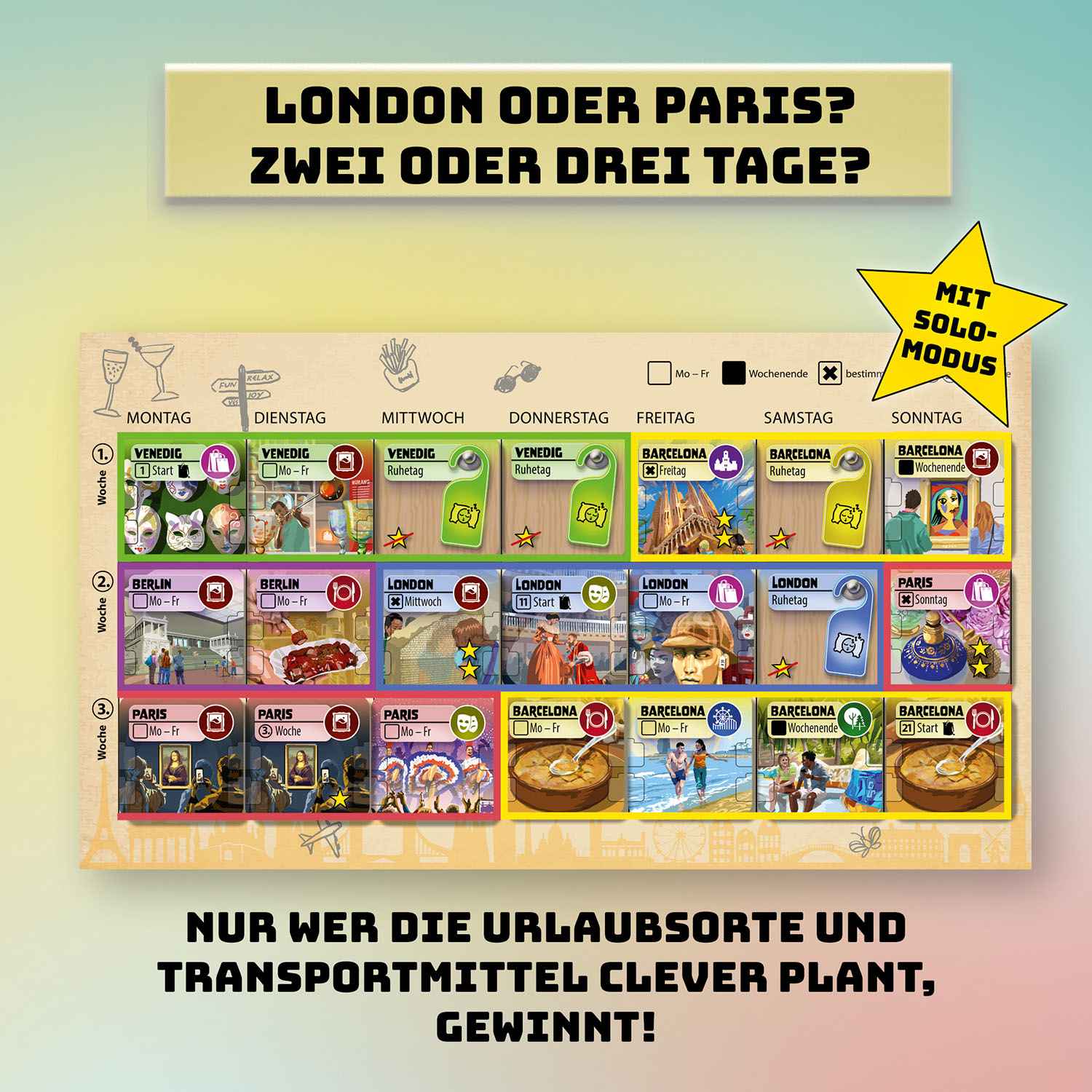 Barcelona, Paris – und danach noch ein Abstecher nach Amsterdam? Drei Wochen Urlaub in Europa laden zu sorgfältiger Planung ein. Die Spielerinnen und Spieler wählen aus drei Angebotsbereichen Stadtplättchen aus sieben beliebten Zielen in Europa und tragen sie in den Wochenplan ein. Die Plättchen zeigen Sehenwürdigkeiten, Shoppingideen, Kulturtipps, lokale Gerichte und vieles mehr. Sie bestimmen, ob eine Stadt unter der Woche, am Wochenende oder an einem bestimmten Tag besucht wird. Längere Aufenthalte bringen mehr Punkte, während die geschickte Wahl der Transportmittel über den reibungslosen Ablauf der Reisen zwischen den Städten entscheidet. Die beste Planung wird mit dem Sieg belohnt. Für zwei bis vier Spielerinnen und Spieler ab zehn Jahren, die ihre Fähigkeiten bei der perfekten Urlaubsplanung unter Beweis stellen möchten.