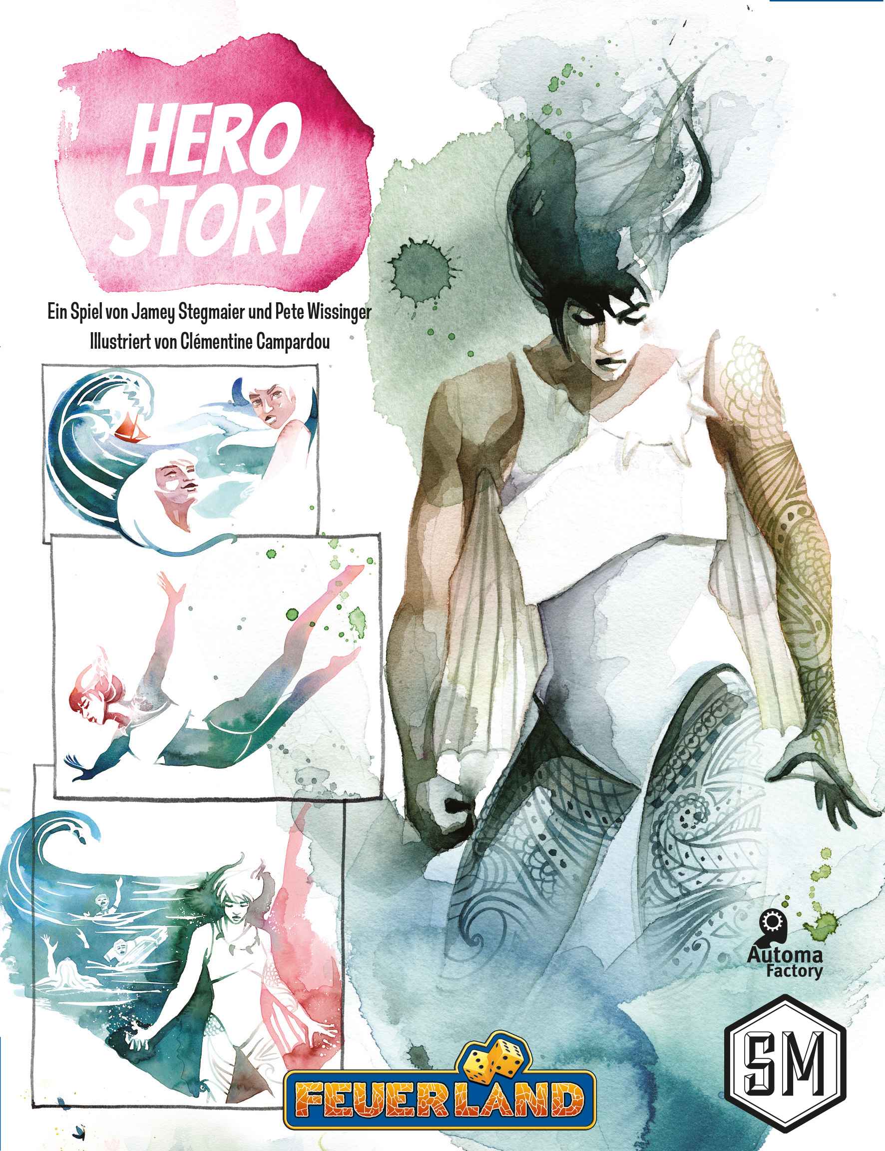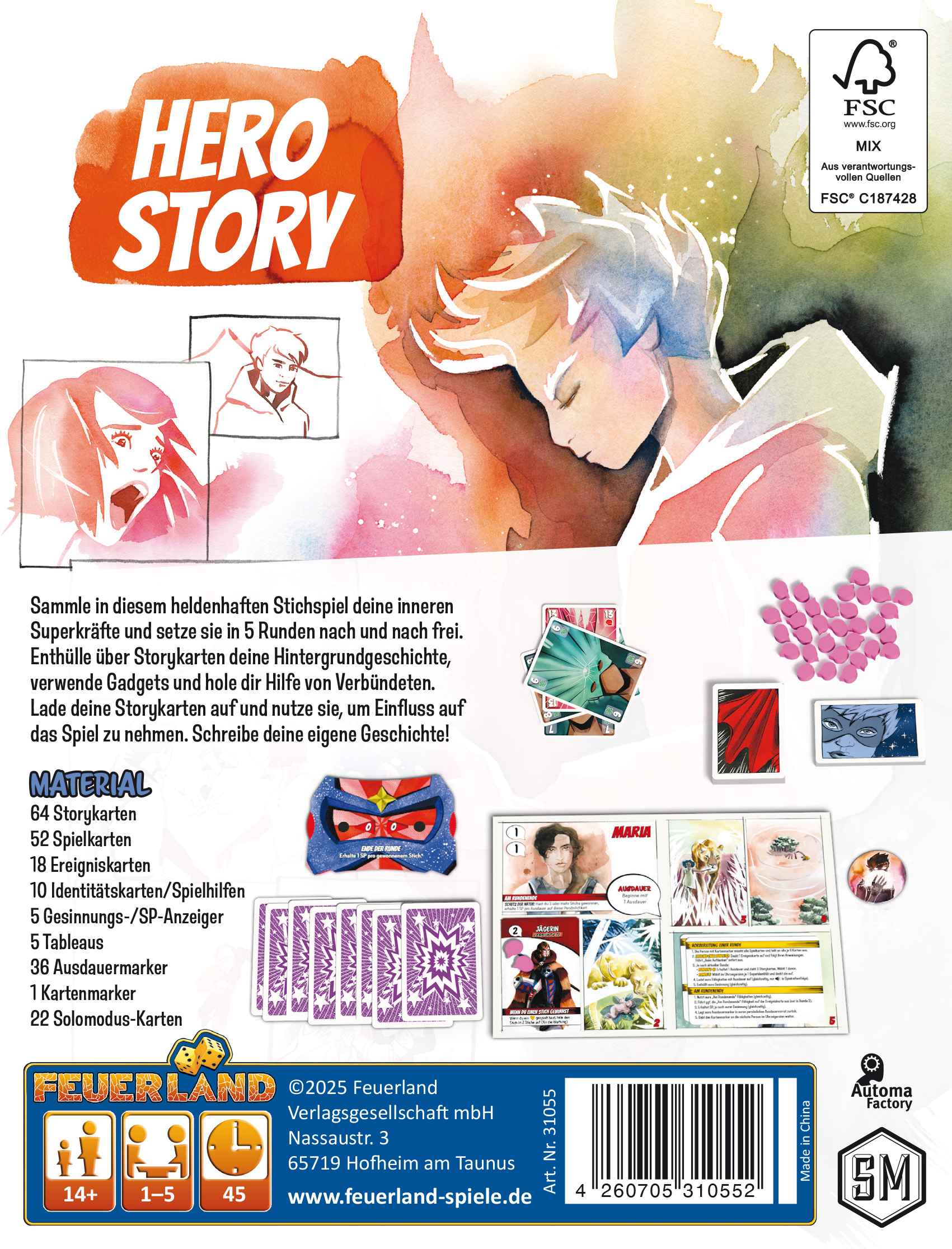 Hero Story ist ein Stichspiel über 5 Runden, dass deine Entwicklung zum (Super-)Helden erzählt. Zu Beginn jeder Runde fügst du deinem Tableau eine weitere Fähigkeit hinzu und entwickelst deine Kräfte so immer weiter. Du kannst diese Fähigkeiten aktivieren, indem du sie mit Ausdauer auflädst. Außerdem wählst du deine Gesinnung für diese Runde. Mit einer guten Gesinnung möchtest du möglichst viele Stiche gewinnen, mit einer bösen Gesinnung alle Stiche verlieren. Während der Runde kannst du das Stichspiel dann mit deinen Fähigkeiten beeinflussen und überraschende Effekte erzielen.