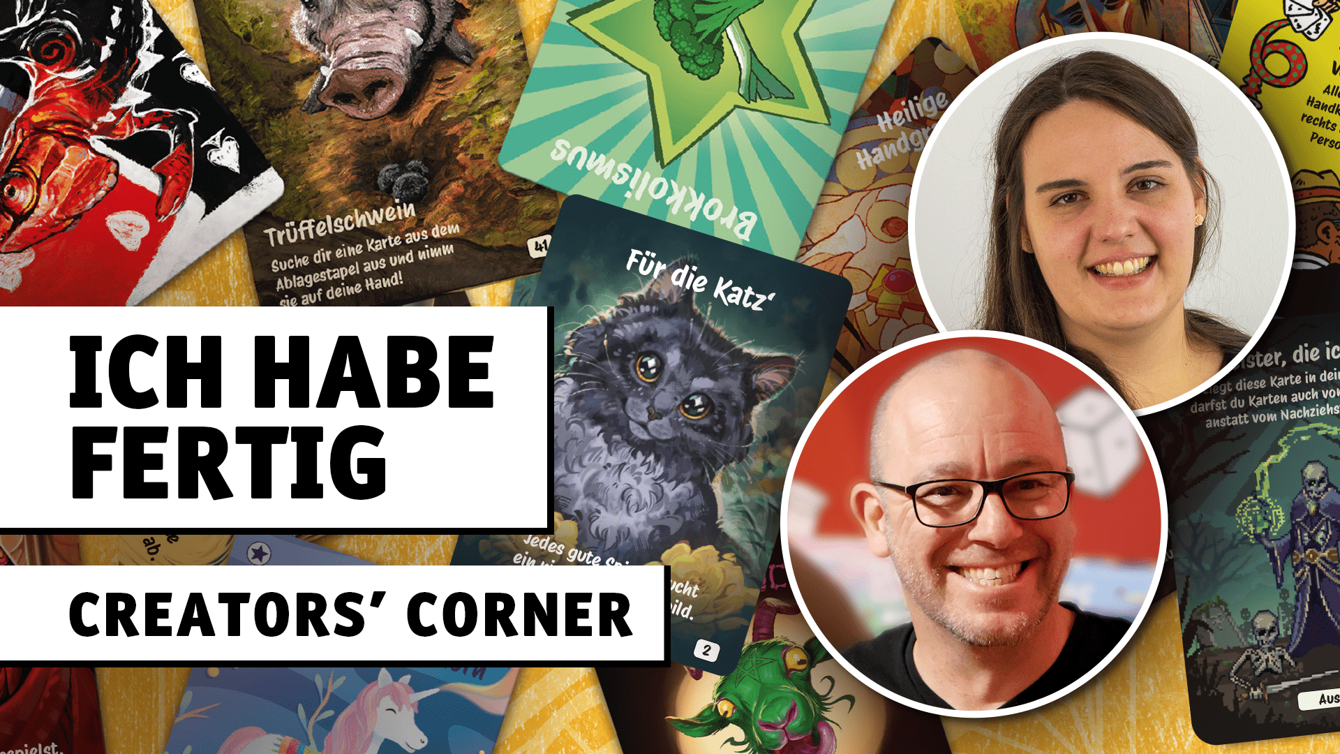 Dank simpler Regeln und einem einfachen Spielaufbau, der lediglich aus einem durchgemischten Nachziehstapel besteht, kann es direkt losgehen mit ICH HABE FERTIG. Die Spielenden ziehen nacheinander entweder eine Karte vom Nachziehstapel oder spielen eine Handkarte aus, indem sie tun, was draufsteht. Zum Beispiel „Chaos“ stiften und alle Handkarten im Spiel mischen und neu verteilen. Oder alle eigenen Karten verschenken. Oder sich von allen Mitspielenden eine Karte schenken lassen. Gespielt wird der Reihe nach im Uhrzeigersinn. Es sei denn, eine Karte sagt etwas anderes. Die Regeln sind hier also eher Richtlinien, außer einer: Wer zuerst die Karten „ICH“ „HABE“ „FERTIG“ vor sich ausliegen hat, gewinnt. Es sei denn, die „Königsmacherin“ oder der „Schmarotzer“ haben ihre Finger im Spiel, oder es ist zufällig 21:34 Uhr...