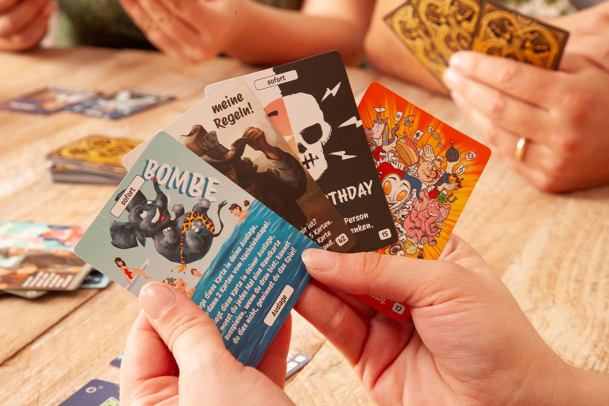 Aber natürlich werden euch eure Mitspielenden nicht so einfach davonziehen lassen und alles geben, um euch zu sabotieren. Und mit Karten wie „Ene mene muh“, „#^..%*“ oder „Schrottwichteln“ gelingt ihnen das besser, als euch lieb ist!