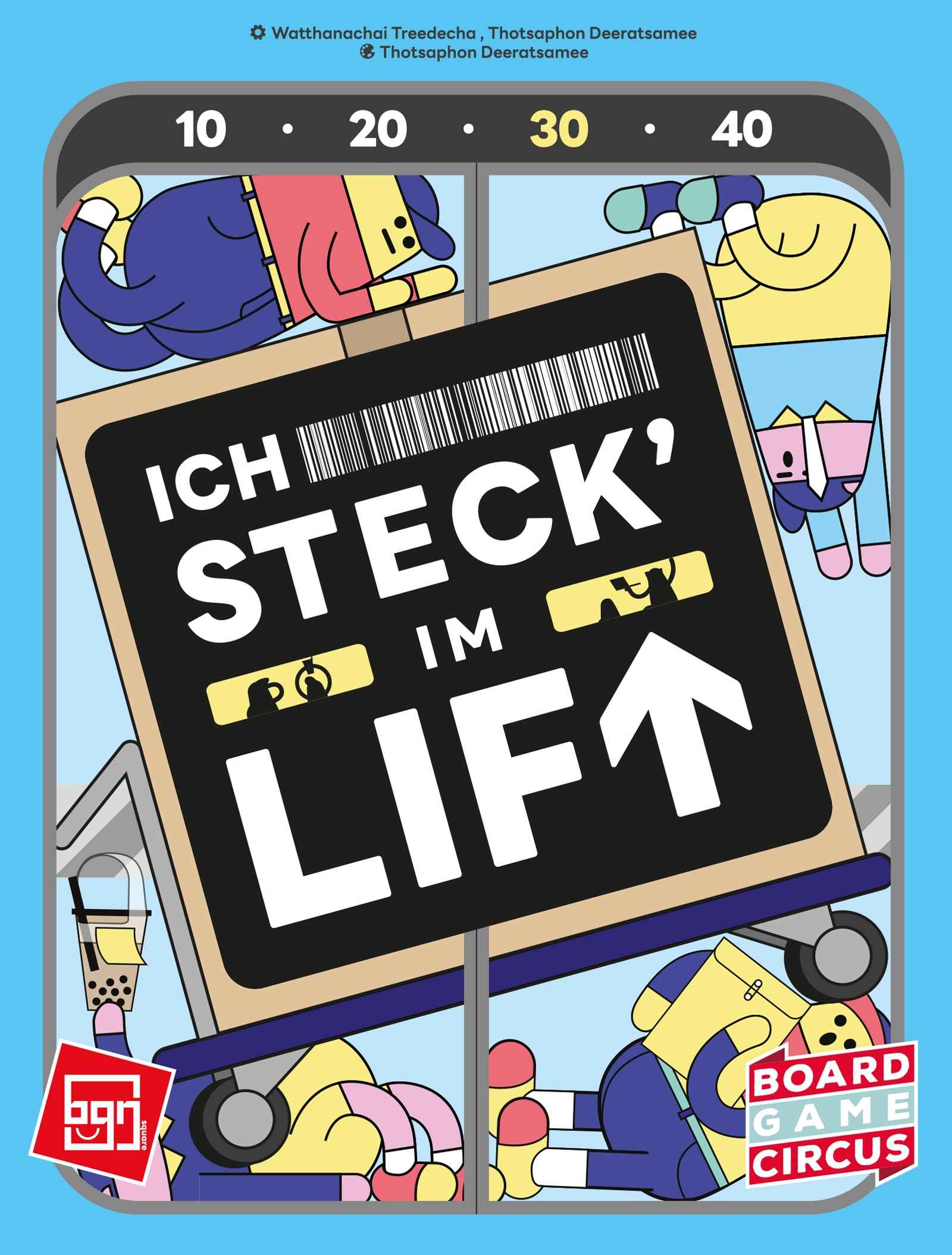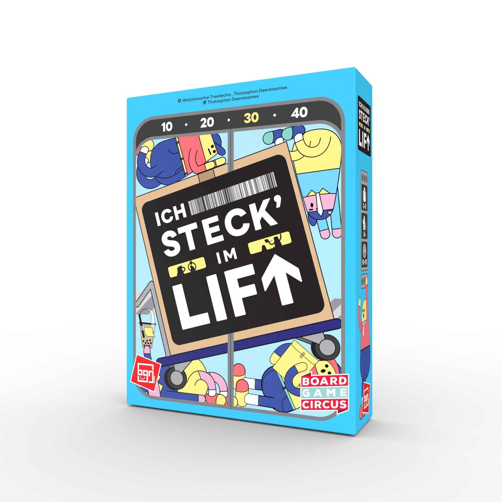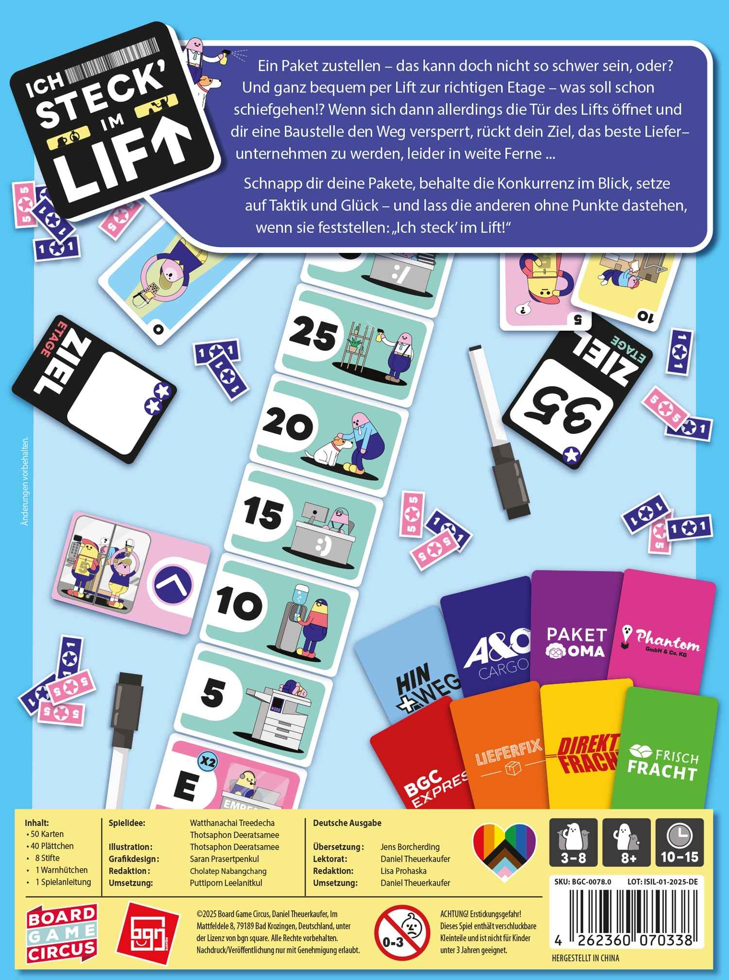 Ein Paket zustellen, das kann doch nicht so schwer sein, oder? Und ganz bequem per Lift zur richtigen Etage - was soll schon schiefgehen!? Wenn sich dann allerdings die TGür des Lifts öffnet und dir eine Baustelle den Weg versperrt, rückt dein Ziel, das beste Lieferunternehmen zu werden, leider in weite Ferne…Schnapp Dir deine Pakete, behalte di Konkurrenz im Blick, setze auf Taktik und Glück – und lass die anderen ohne Punkte dastehen, wenn sie feststellen: Ich steck` im Lift! „ich steck’ im Lift ist unser chaotisch spaßiges Kartenspiel. Die Aufgabe ist eigentlich ganz einfach: Ein Paket auf der richtigen Etage abliefern. Allerdings kommt dir deine Konkurrenz immer in die Quere und dann ist auch immer irgendeine Etage aufgrund einer Baustelle gesperrt. Der Spielablauf ist simpel, wie genial: Etage Wählen, Lift bewegen und mit etwas Glück und Geschickt Punkte erhalten. Schreibt gleichzeitig eine eigene Fahrkarte und legt sie verdeckt auf den Tisch. Deckt dann alle Karten gleichzeitig auf. Addiert die Werte aller Karten und bewegt den Lift entsprechend weiter. Danach hält er an. Hält der Lift auf einer Etage, die du aufgeschrieben hast, decke diese Zielkarte auf. Dur erhältst du so viele Punkte , wie Sterne oben links auf der Karte sind. Schreibe anschließend eine neue Etage auf diese Karte. Bewegt das Warnhütchen eine Etage nach unten und beginnt eine neue Runde.