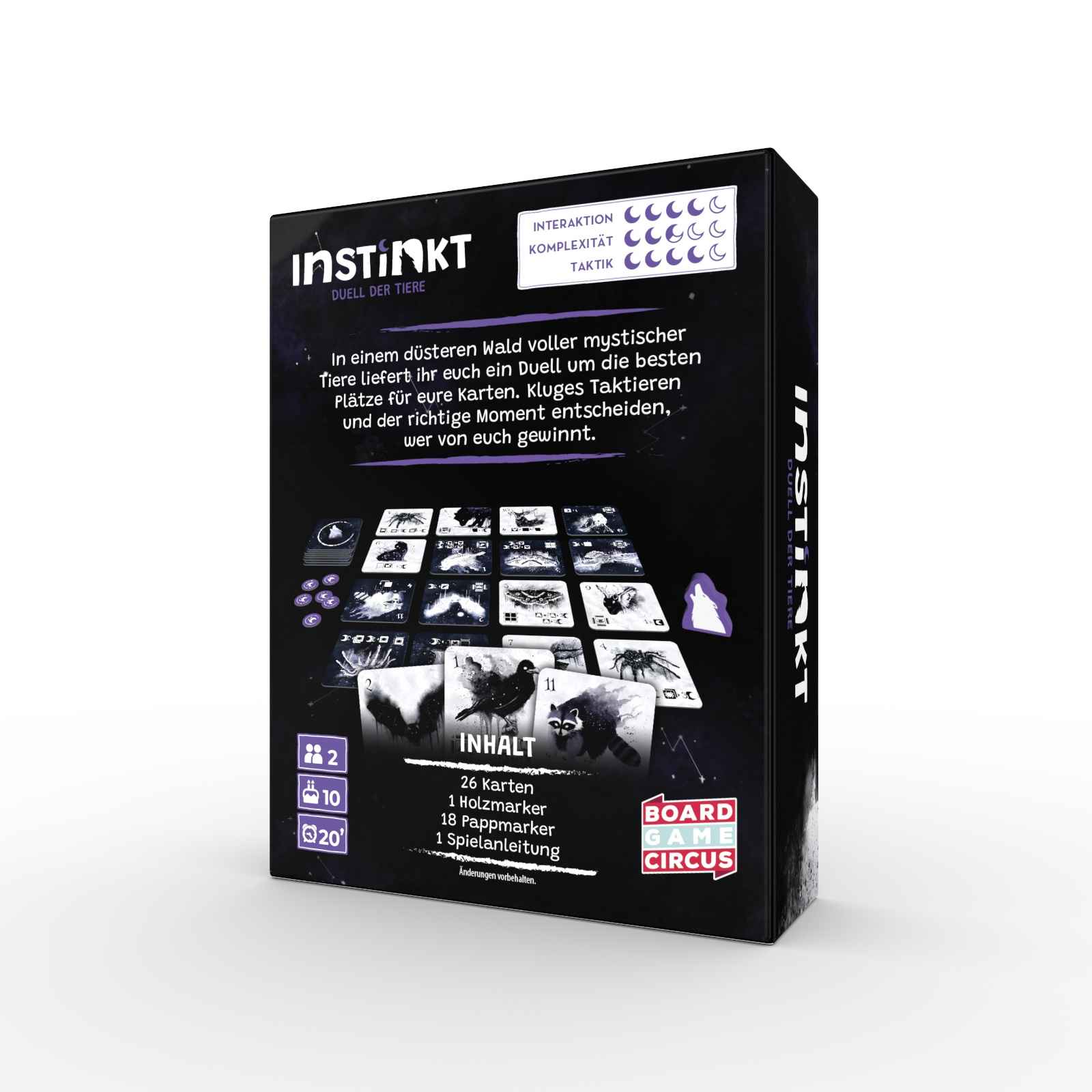 "In einem düsteren Wald voller mystischer Tiere liefert ihr euch ein Duell um die besten Plätze für eure Karten. Kluges Taktieren und der richtige Moment entscheiden, wer von euch gewinnt.Stellt euch der Herausforderung in Instinkt – Duell der Tiere, einem spannenden Legespiel für zwei Personen! Taucht ein in einen düsteren Wald voller mystischer Kreaturen und liefert euch ein packendes Duell. Abwechselnd legt ihr Karten in eine gemeinsame 4×4-Auslage. Um Punkte zu sammeln, müsst ihr eure Karten an den richtigen Platz legen – manchmal zählt dabei auch das perfekte Timing! Am Ende entscheidet, wer die klügsten Züge gemacht hat und die meisten Punkte ergattert.Instinkt – Duell der Tiere ist perfekt für alle, die taktische und konfrontative Spiele lieben und ihre Strategie an die Aktionen ihres Gegenübers anpassen möchten. Nur wer clever plant und flexibel reagiert, wird das Duell gewinnen."