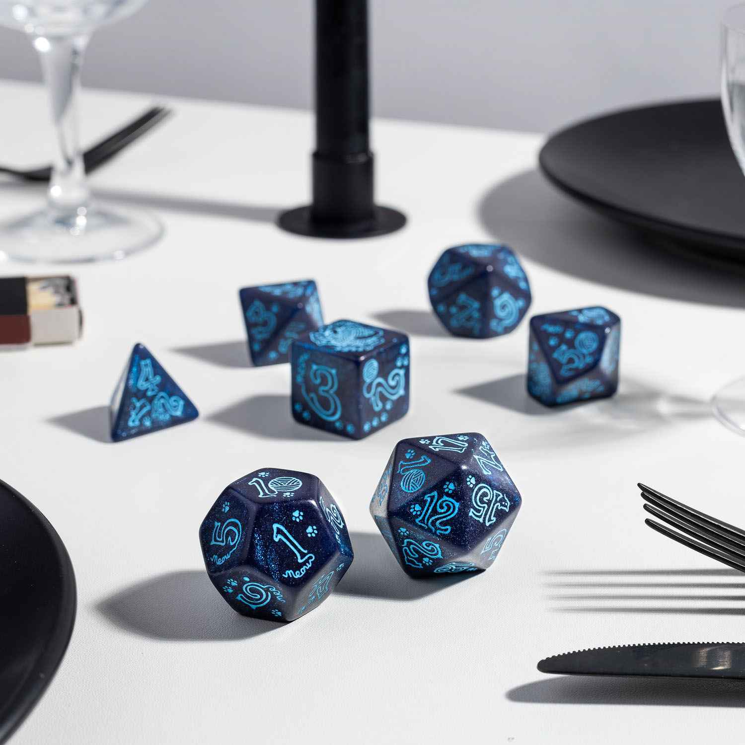By all that’s furry, River has grown! This jumbo set carries the essence of a dignified day cat: elegant, composed, and quietly commanding. First to appear outside the Kickstarter campaign, this big-sized dice set is colored with a mix of navy and blue. It reflects the cat’s regal presence, perfect for cat lovers, collectors, and players seeking a standout premium set.