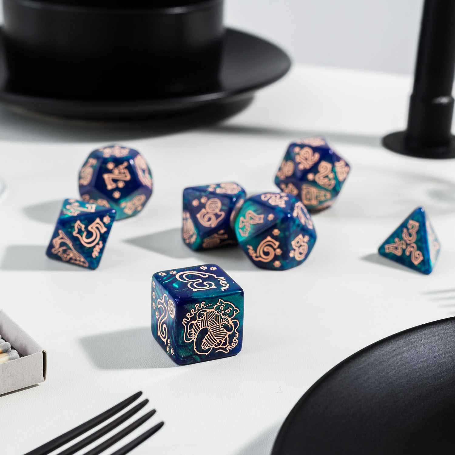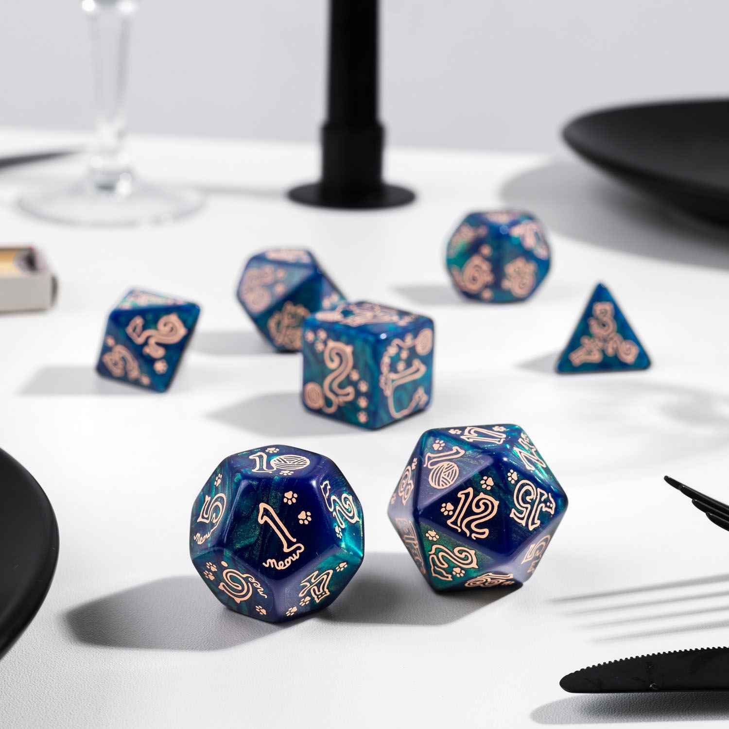 By all that’s furry, Whiskers has grown! This jumbo set carries the essence of a dignified day cat: elegant, composed, and quietly commanding. First to appear outside the Kickstarter campaign, this big-sized dice set is colored with a mix of green and blue hues. It reflects the cat’s regal presence, perfect for cat lovers, collectors, and players seeking a standout premium set.