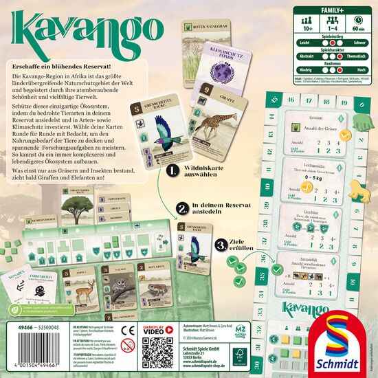 Wir befinden uns im größten länderübergreifenden Naturschutzgebiet der Erde: Der Kavango-Region in Afrika. Als Naturschutzexperten wollen wir Tiere in unser Reservat locken, Forschungsziele erfüllen und in Arten- und Klimaschutz investieren. Dabei gilt es, die Voraussetzungen der Tiere zu beachten und ein immer komplexeres Ökosystem aufzubauen: Was langsam mit Gräsern und Insekten startet, zieht schon bald Giraffen und Elefanten an! Wer behält alle Ziele im Auge und macht am Ende die meisten Punkte in seinem Reservat?