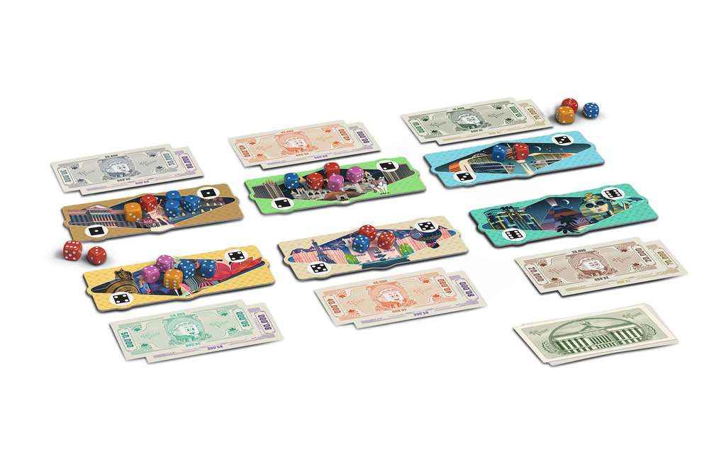 | Inhalt: | 36 Würfel, 6 große Würfel, 6 Casinos, 1 Bandit, 48 Geldkarten, 1 Startspielerkarte, 1 Spielanleitung |