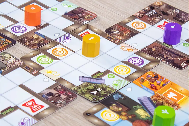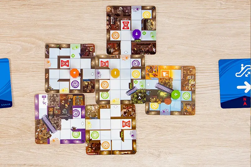 Magic Maze Pocket ist ein kooperatives Echtzeitspiel, bei dem eine Partie weniger als 15 Minuten dauert und sich durch das kompakte Format ideal zum Mitnehmen eignet. Gemeinsam bewegen die Spielenden ihre Held*innen durch das Labyrinth. Jede*r Mitspielende*r hat dabei die Fähigkeit, jede beliebige Figur genau eine konkrete Aktion (z.B. nach Norden gehen, die Rolltreppe nutzen) ausführen zu lassen. Schaffen es alle Abenteurer*innen, das Einkaufszentrum innerhalb der vorgegebenen Zeit zu verlassen und dabei jeweils einen ganz bestimmten Gegenstand zu stehlen, gewinnen alle gemeinsam. Doch dazu müssen sich die Spielenden gut abstimmen, ohne dabei zu kommunizieren.