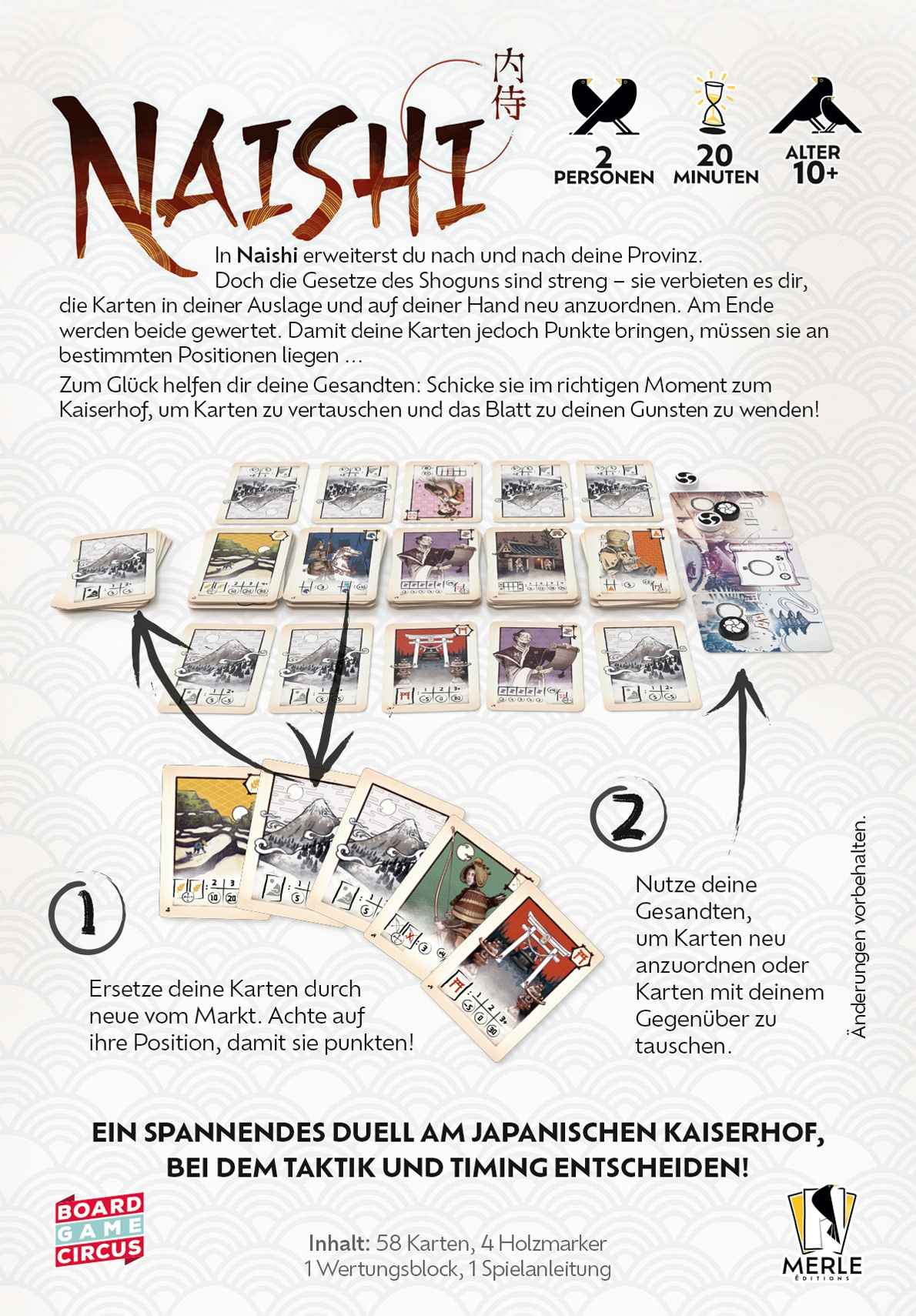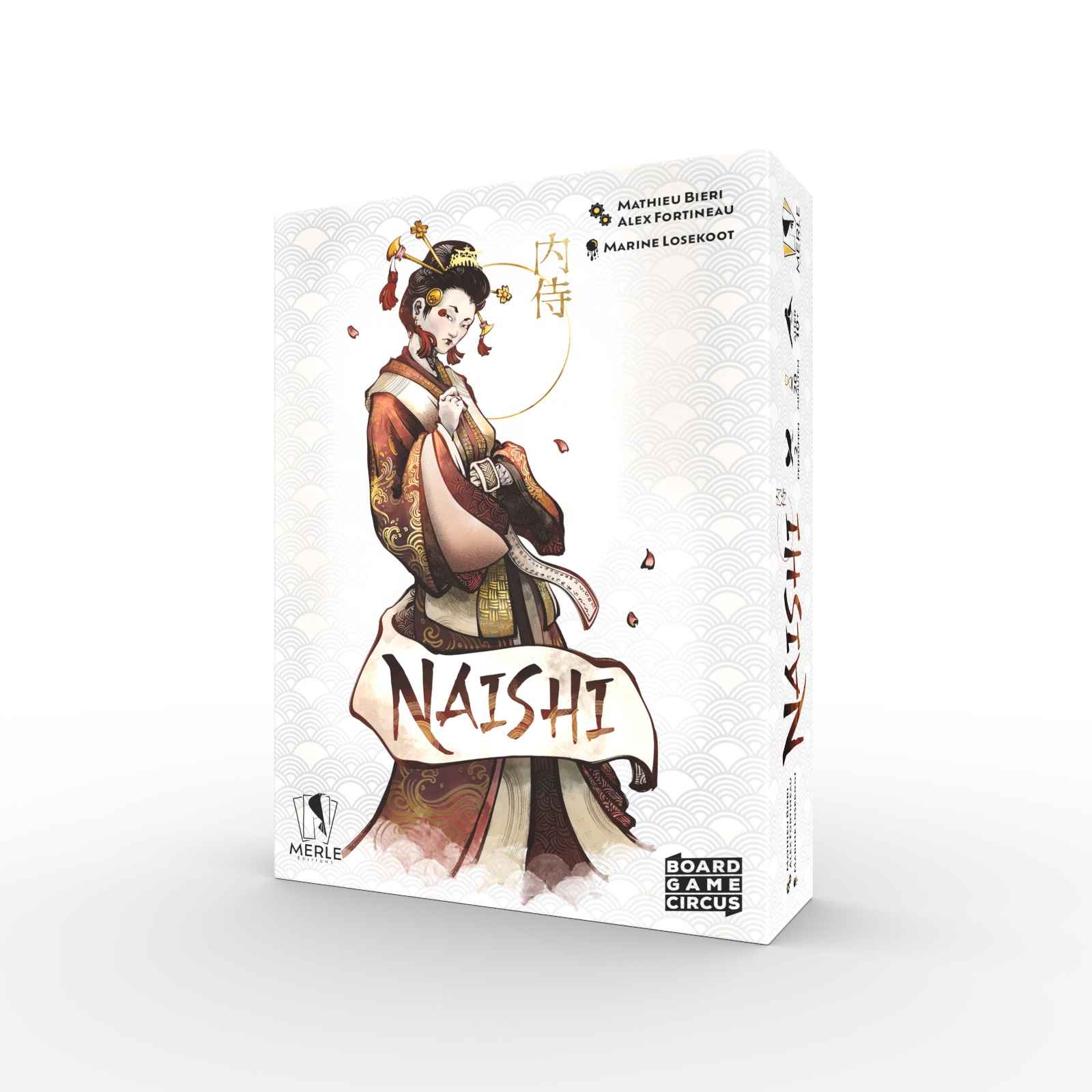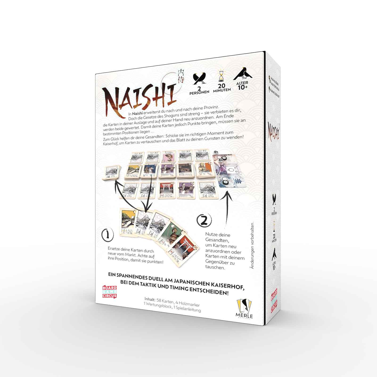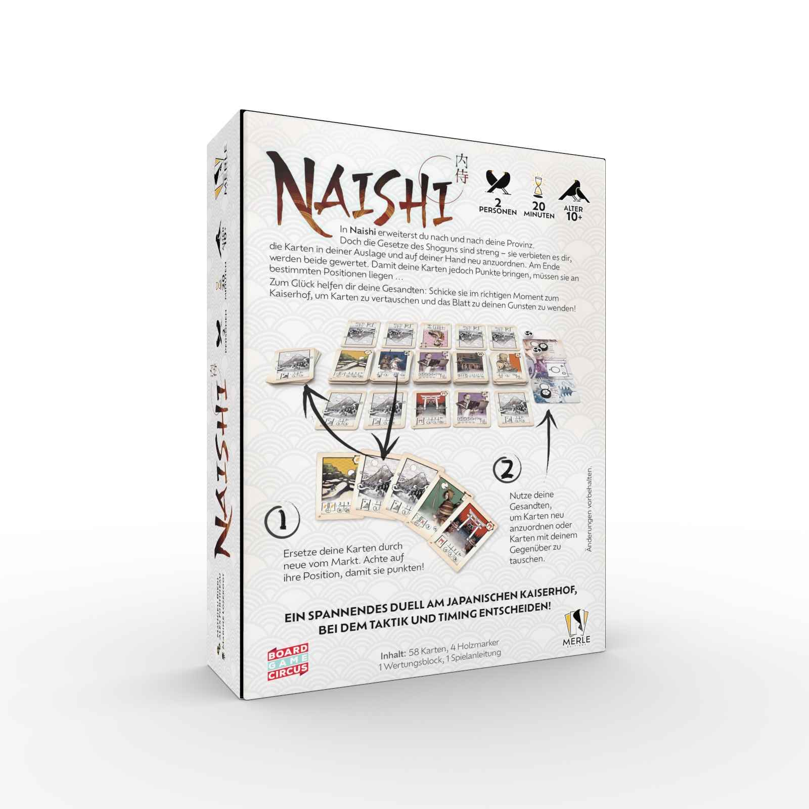 "Eine Naishi war im feudalen Japan eine Frau, die am Kaiserhof diente. Als Hofdame hatte sie eine wichtige Rolle und viele Aufgaben. Naishia stammten oft aus adligen Familien und hatten großen Einfluss.Naishi ist ein spannendes und taktisches Kartenspiel für zwei Personen. Runde für Runde tüftelt ihr an eurer perfekten Auslage und optimiert eure Handkarten, um mit den besten Kombinationen die meisten Punkte zu erzielen. Doch Aufgepasst – die Position der Karten in eurer Hand und Auslage ist entscheidend, und euer Gegenüber kann eure Pläne durchkreuzen!In Naishi baust du dir mit Karten deine eigene Provinz auf. Doch die Gesetze des Shoguns sind streng – sie verbieten es dir, deine Karten neu anzuordnen. Damit sie Punkte bringen, müssen sie aber an bestimmten Positionen liegen … Zum Glück helfen dir deine Gesandten: Schicke sie im richtigen Moment zum Kaiserhof, um Karten zu vertauschen und das Blatt zu deinen Gunsten zu wenden!Du hast eine Hand und eine Auslage mit jeweils 5 Karten. Sie bilden zusammen deine Provinz. Du darfst die Positionen deiner Karten nicht einfach so verändern – weder in deiner Auslage noch auf deiner Hand! Im Laufe des Spiels wirfst du Karten von deiner Provinz ab und ersetzt sie durch Karten vom Markt – auch dabei bleibt ihre Position unverändert! Jede Karte bringt auf unterschiedliche Weise Punkte. Achte also darauf, wo welche Karte sein muss, damit sie punktet.Zusätzlich kannst du deine Gesandten zum Kaiserhof schicken, um Bonusaktionen zu nutzen und z. B. Karten zu vertauschen. Am Spielende legst du deine Handkarten in einer Reihe unter deine Auslage, sodass ein 2×5-Raster entsteht. Dann wird gewertet. Wer die meisten Punkte für seine Karten erhält, gewinnt!"