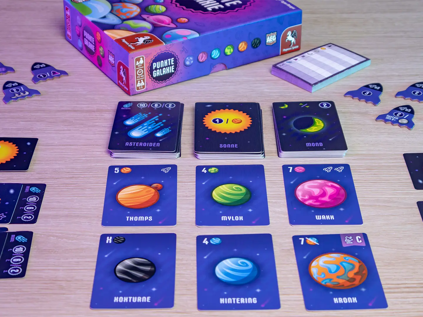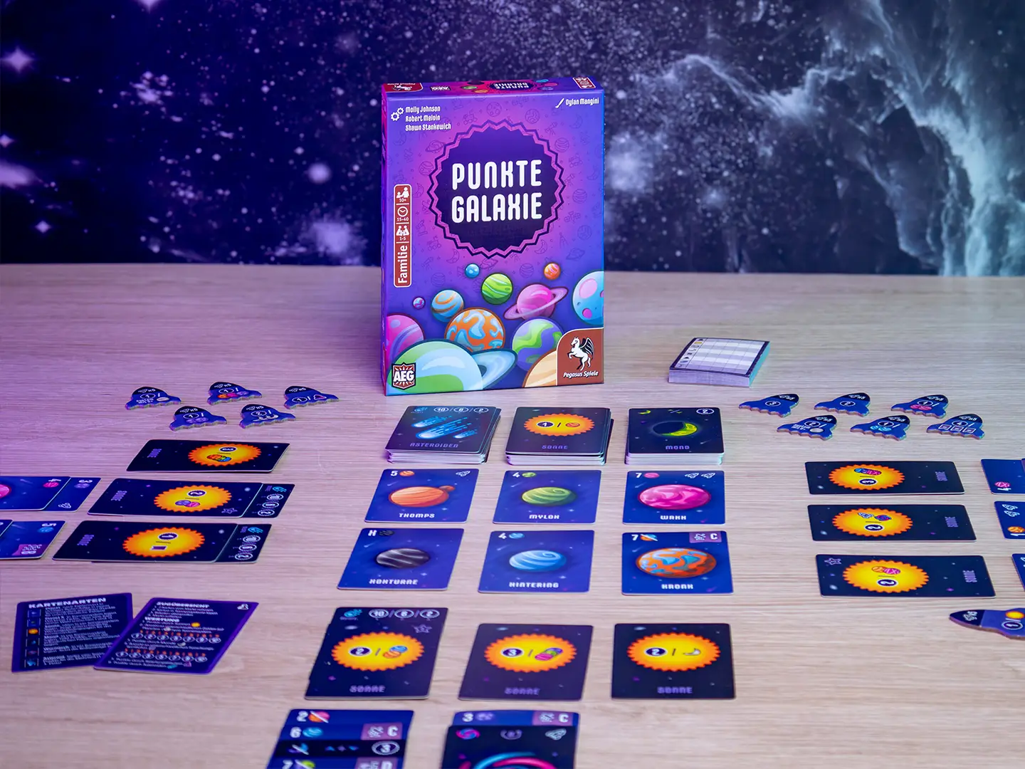 Nach dem Erfolg von Punktesalat, das 2021 auf der Empfehlungsliste Spiel des Jahres stand, erscheint nun Punktegalaxie. Dieses Mal bringen nicht Kohl, Möhre und Co Punkte, sondern Sonne, Mond und mehr. In jeder Runde wählen die Spielenden zwei Karten aus der offenen Auslage aus und legen sie in ihre Galaxie, die aus beliebig vielen Sonnensystemen bestehen darf. In jedem Sonnensystem darf jedoch nur eine Sonne und ein Asteroid liegen, aber beliebig viele Mond-, Wurmloch- und Planetenkarten. Jede Kartenart hat dabei individuelle Anlegebedingungen und bringt andere Punkte ein. Durch wechselnde Endwertungsbedingungen sowie eine Mehrheitenwertung, bleibt jede Partie spannend bis zum Schluss.
