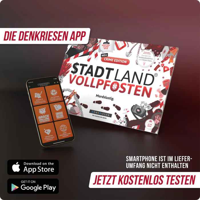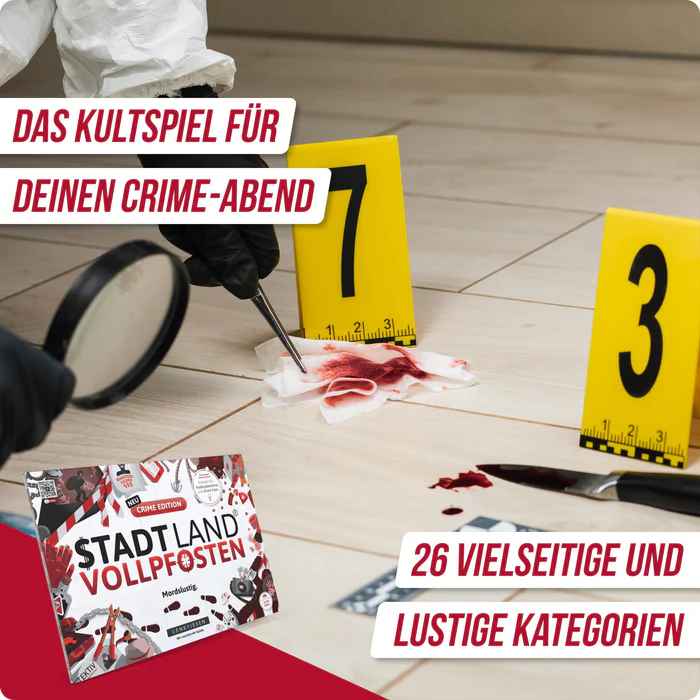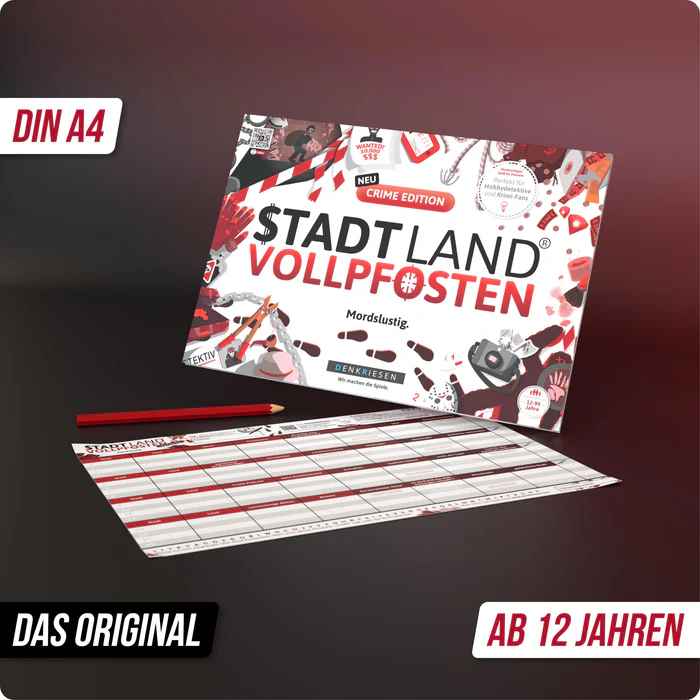 Die mörderische Edition des Kultspiels STADT LAND VOLLPFOSTEN rund ums Thema Verbotenes und Kriminalfälle. Dieser Spielblock mit 26 kreativen und lustigen Kategorien ist perfekt für einen unvergesslichen Krimi-Abend mit Familie und Freunden.