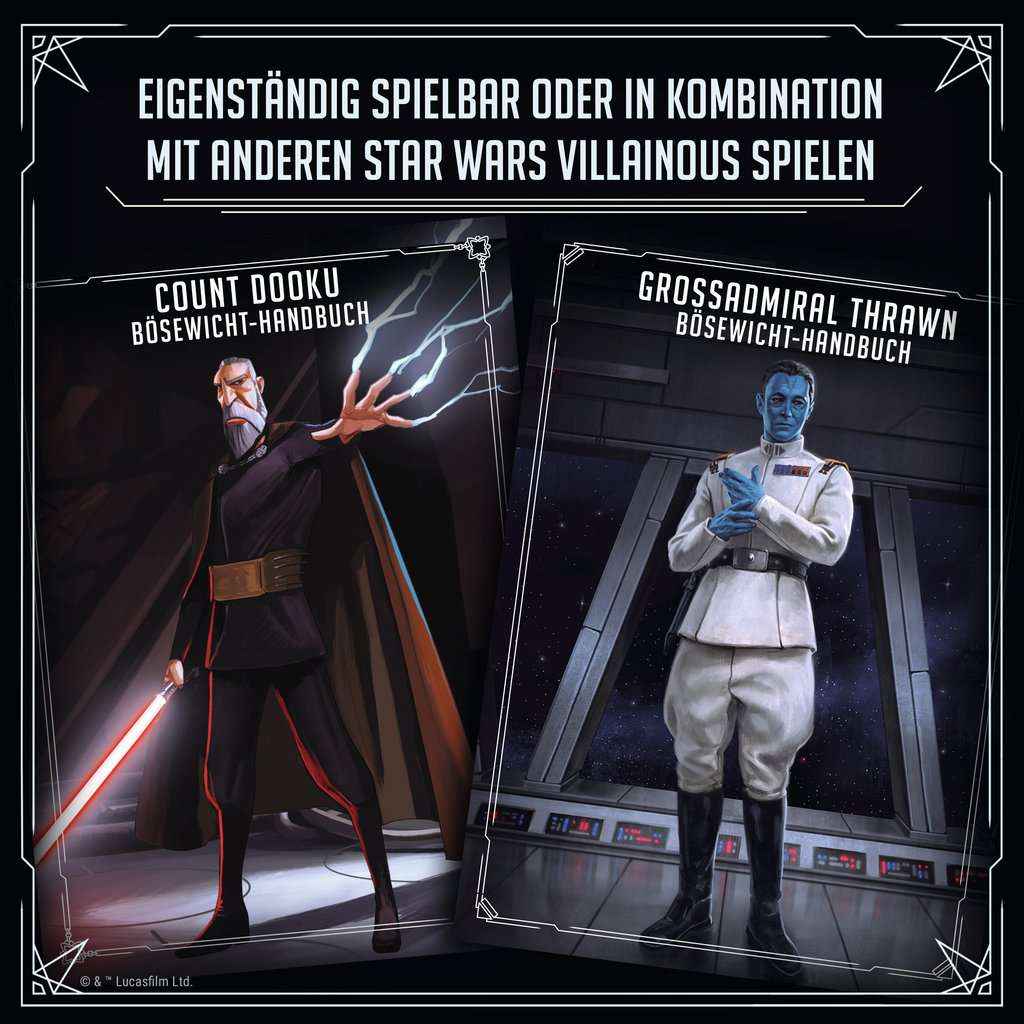 Zwei kultige Star Wars-Schurken gesellen sich zum preisgekrönten Spielsystem Star Wars Villainous. Diese Erweiterung ist eigenständig oder in Kombination mit anderen Star Wars Villainous-Ausgaben spielbar! Jeder Schurke verfügt über ein Kartendeck mit einer Spielstrategie, die von den Filmen und Serien inspiriert ist. Mit einer teuflisch-guten Kartenstrategie versuchen die Spieler ihr individuelles Ziel zu erreichen, um der größte Bösewicht im Universum zu werden.