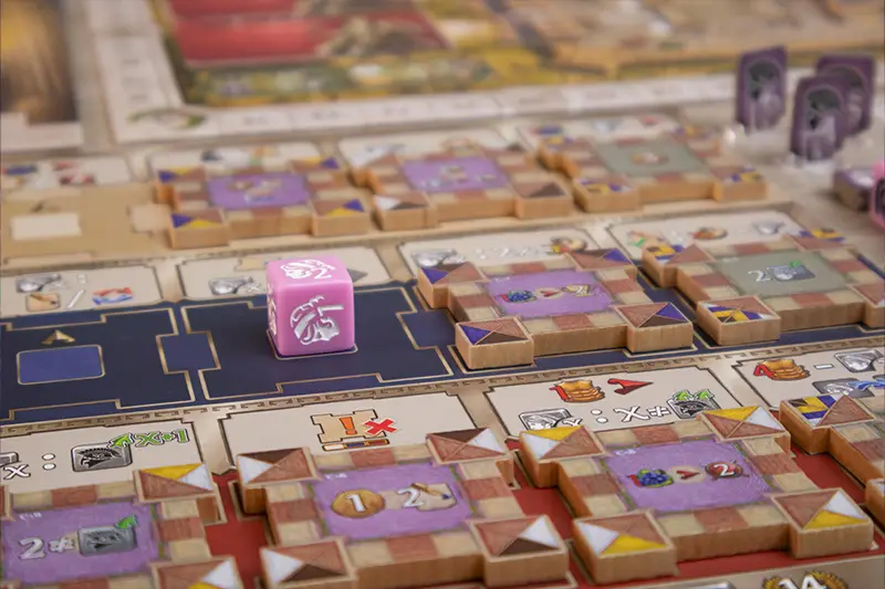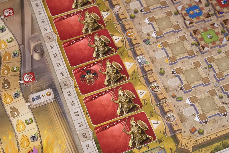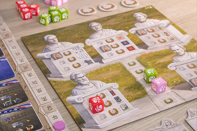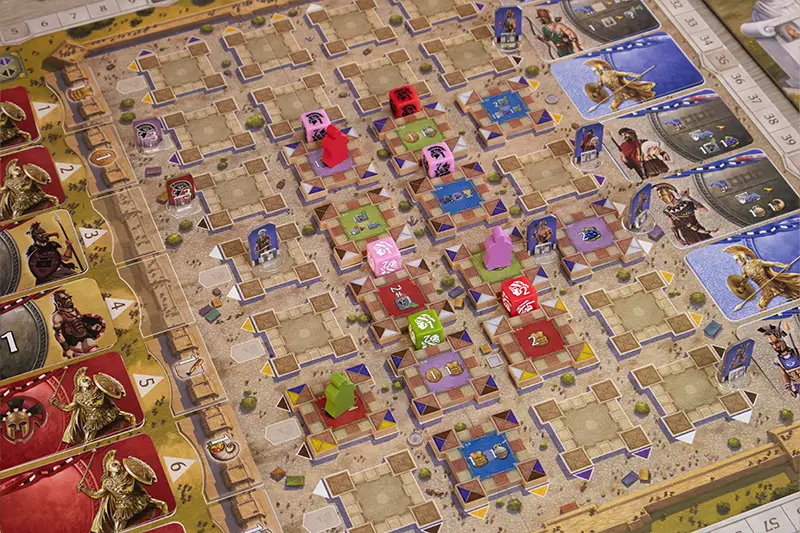 | Inhalt: | 1 Spielplan, 1 Ratstafel, 1 Altartafel, 4 Anwesenstafeln, 44 Würfel, 50 Kadmeiasteine, 118 Karten, 186 Plättchen, 26 Marker, 4 Spielfiguren, 8 Aufsteller, 24 Standfüße, 8 Spielhilfen, 1 Anleitung, 1 Glossar |