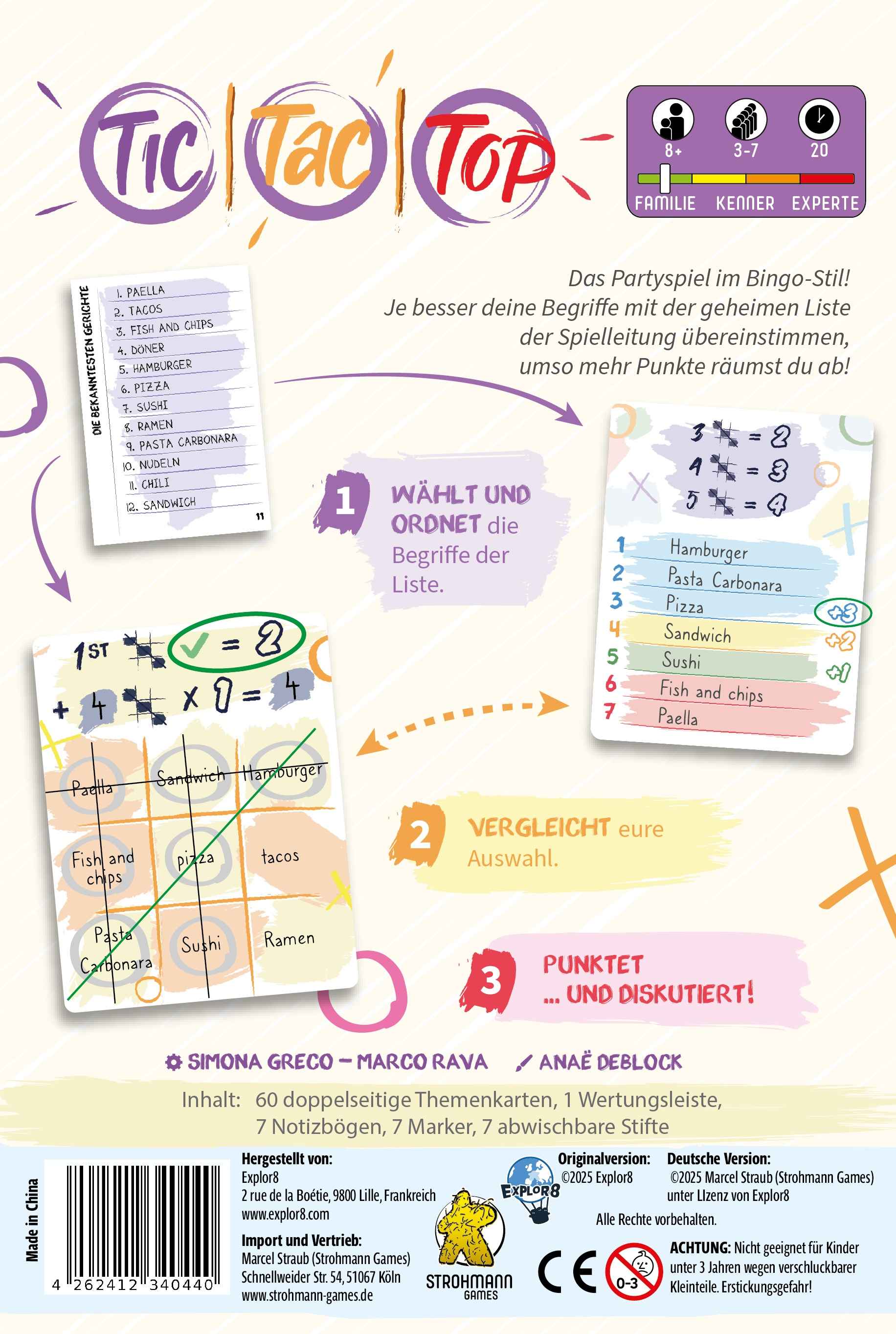 Tic Tac Top ist das Partyspiel im Bingo-Stil für die ganze Familie. Ein Thema, zwölf Begriffe und ganz viel Diskussionsbedarf… Um zu gewinnen, gibt es nur eine Antwort: Sammle so viele Übereinstimmungen mit der Spielleitung wie möglich!
