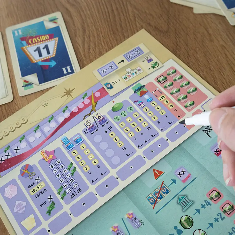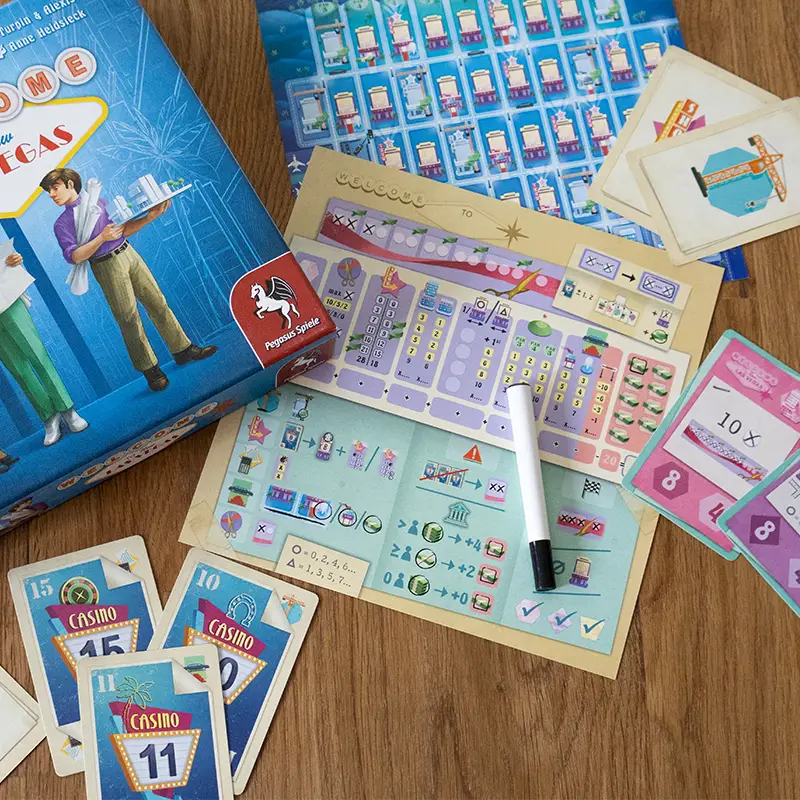 In diesem Flip&Write-Spiel haben alle die gleichen Vorgaben. Einzig die Entscheidungen der Spielenden bestimmen, wessen Stadt am Ende die meisten Touristen anzieht und das große Geld macht. Welcome to New Las Vegas ist der dritte Teil der Welcome-to-Reihe und das anspruchsvollste der drei Spiele.