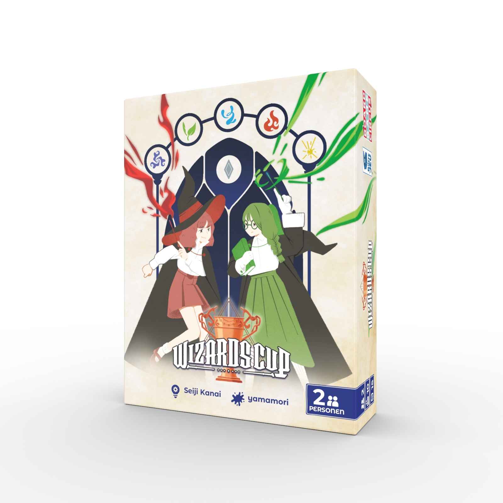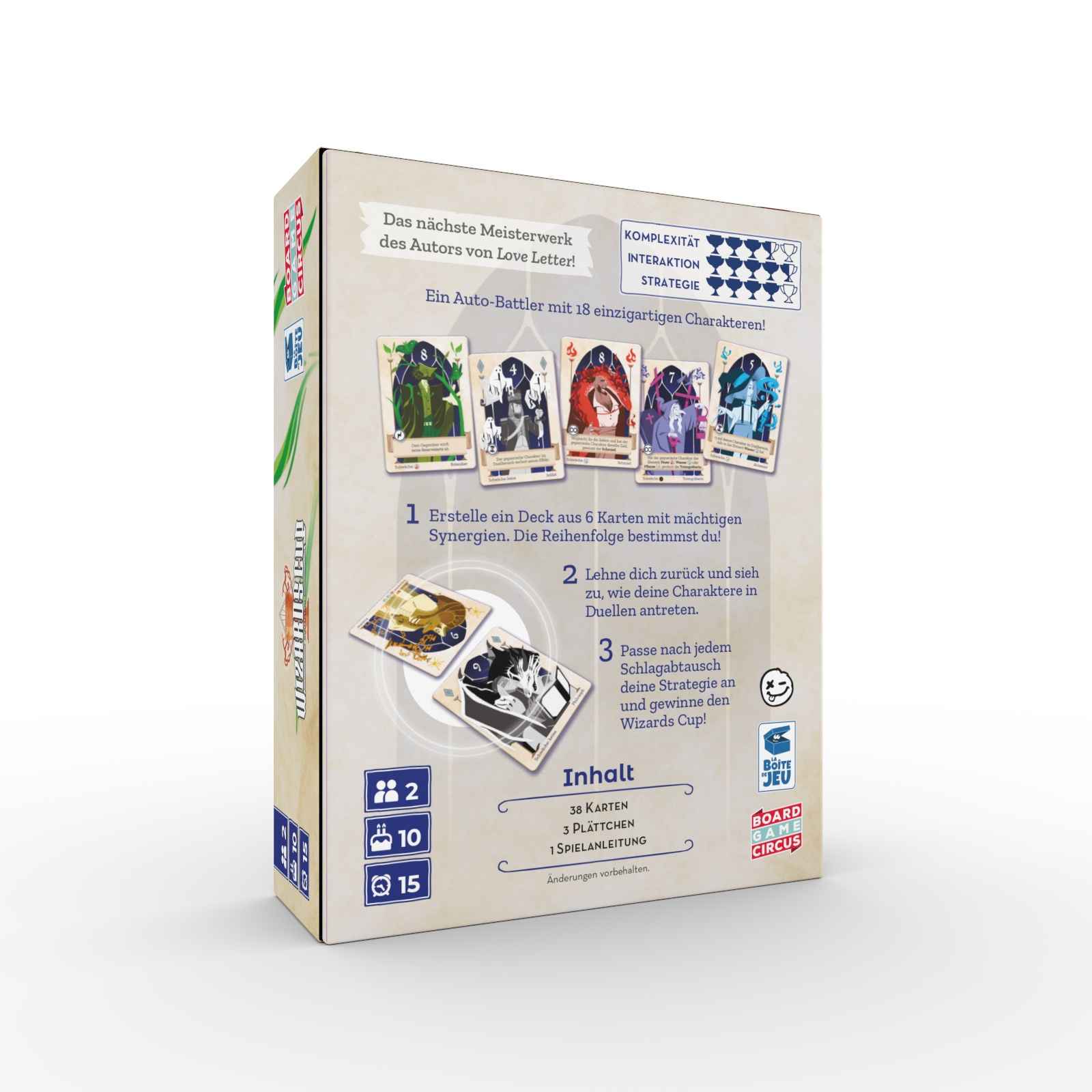"Heute findet das große magische Turnier zwischen den Besten der Besten aller Hexen und Zauberer statt: der Wizards Cup! Lehnt euch zurück und genießt die Show!Wizards Cup ist ein Auto-Battler in kompakter Schachtel aus der Feder von Seiji Kanai, dem Autor des Klassikers Love Letter. Zu Beginn stellt ihr euer persönliches Deck zusammen und tretet gegeneinander an. Nach dem ersten Schlagabtausch könnt ihr eure Strategie anpassen, doch euer Gegenüber bleibt ebenfalls nicht untätig! Mit cleveren Entscheidungen und der richtigen Taktik sichert ihr euch den Sieg.Wizards Cup wird über 2 bis 3 Runden gespielt. Wer zuerst 2 Runden gewinnt, gewinnt die Partie! In jeder Runde spielt ihr mit 6 Karten aus eurem Set. Eure Charaktere liefern sich so lange einzeln Duelle mit den gegnerischen Charakteren, bis feststeht, wer die Runde gewonnen hat."