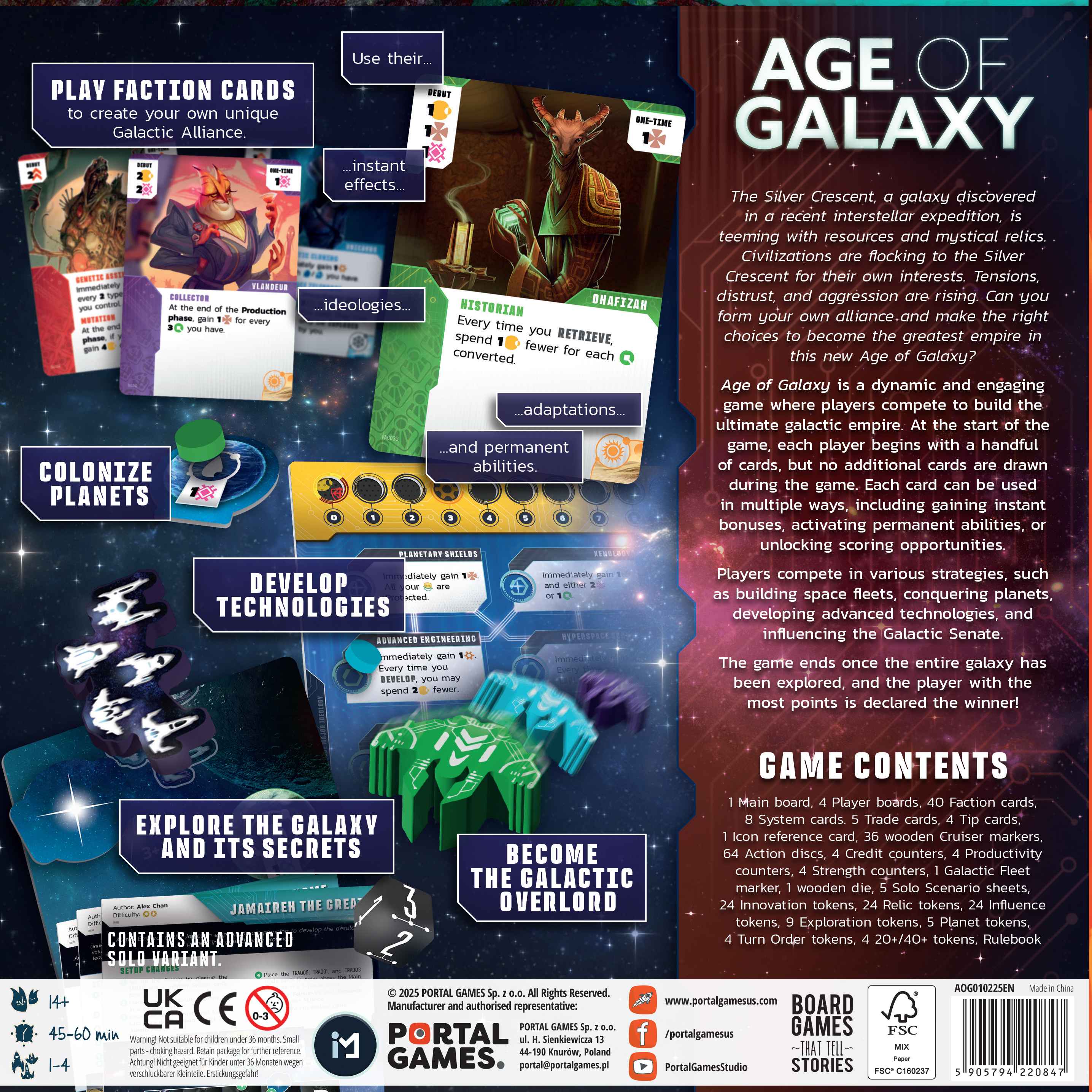 Age of Galaxy — a new edition of the popular strategic card game originally published by ICE Makers and designed by Jeffrey CCH. This sf card game features over 30 unique factions, each with its abilities and strategic options. Similarly to Imperial settlers, faction cards can be played in multiple ways — in this game players can play them either integrated into their Empire or sacrifice for onetime benefits through agreements. The game allows exploration, colonization, building a space fleet, and technological development, which can take different paths for each player, opening many routes to victory. Portal Games is introducing completely new graphic design, enhanced solo mode, and improved components to enrich the gameplay experience.