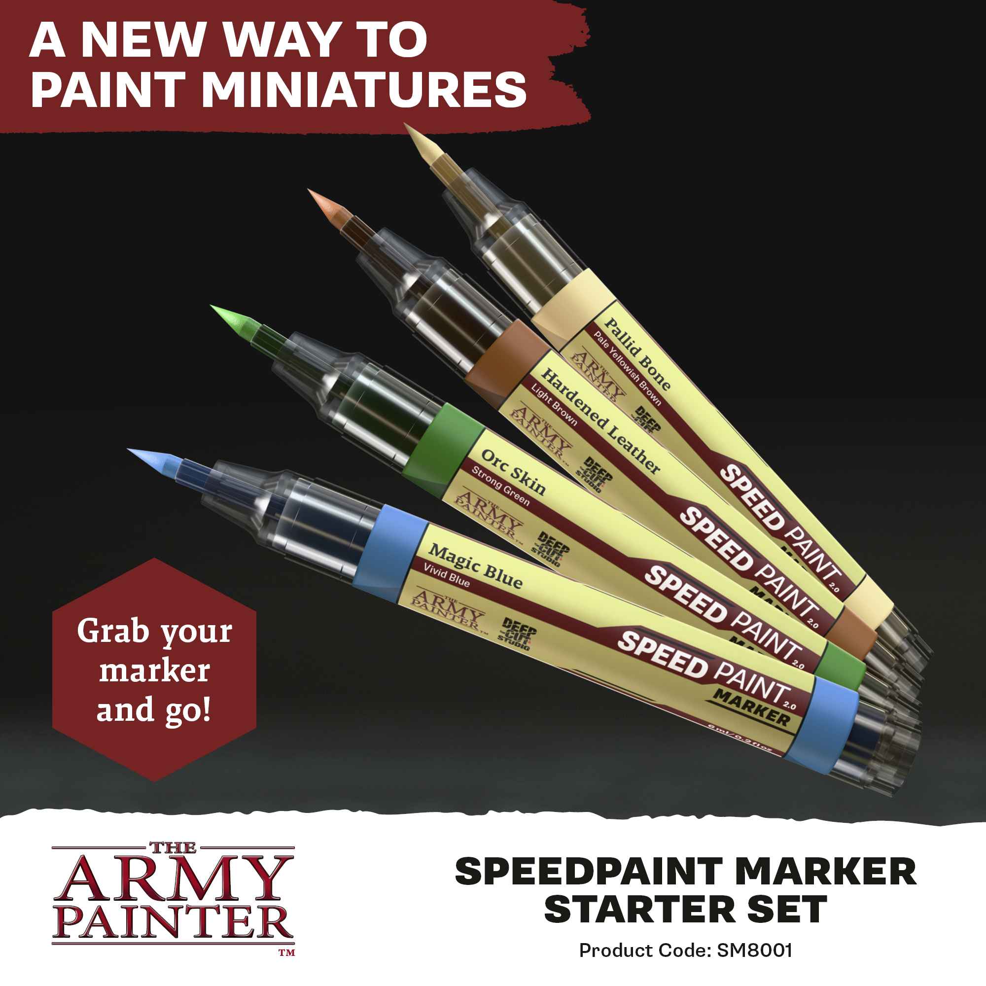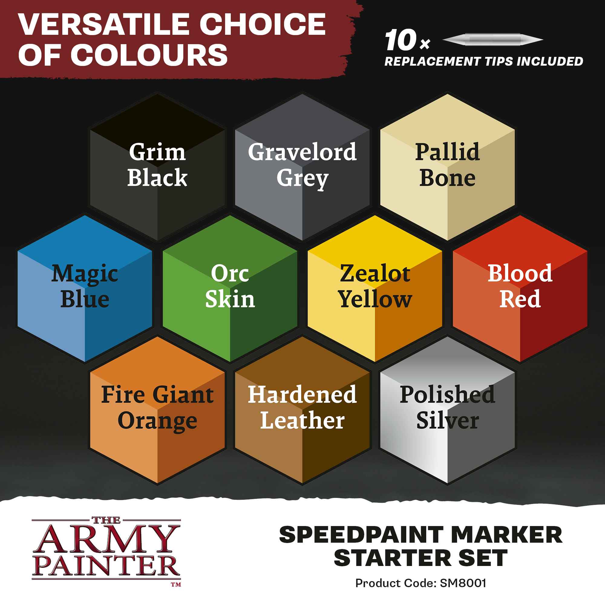 This set includes 10 x 6ml Speedpaint Markers. Inside each marker is our fanfavourite Speedpaint 2.0 formula, including 9 highly saturated and specially designed Speedpaint Acrylic colours and one Speedpaint Metallic paint.