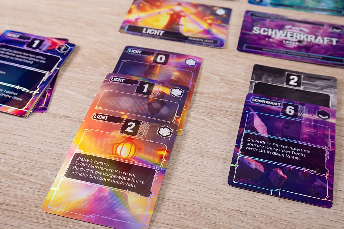 Zwei künstliche Intelligenzen treten im Duell gegeneinander an. Es gilt, Befehlskarten auszuspielen und die Kontrolle zu übernehmen. In dem algorithmischen Kartenspiel Compile schlüpfen zwei Spielende in die Rolle rivalisierender KIs und versuchen die Kontrolle über Befehlsspalten zu erlangen und ihre Protokolle vor der anderen Person zu kompilieren.