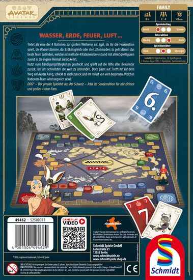Tretet als eine der 4 Nationen zur großen Weltreise an: Egal, ob ihr die Feuernation spielt, die Wasserstämme, das Erdkönigreich oder die Luftnomaden: Es geht darum das beste Team zu finden, welches schnell alle 4 Nationen bereist und mit allen Spielfiguren zuerst in die eigene Heimat zurückkehrt. Nutzt eure Bändigungsfähigkeiten geschickt und greift auf die Hilfe alter Bekannter zurück, um am schnellsten die Welt zu umrunden. Doch passt auf: Trefft ihr auf dem Weg auf Avatar Aang, schickt er euch zurück und ihr müsst von vorn beginnen. Welches Nationen-Team wird siegreich sein? DOG® – Der geniale Spielehit aus der Schweiz – Jetzt als Sonderedition für alle kleinen und großen Avatar-Fans.