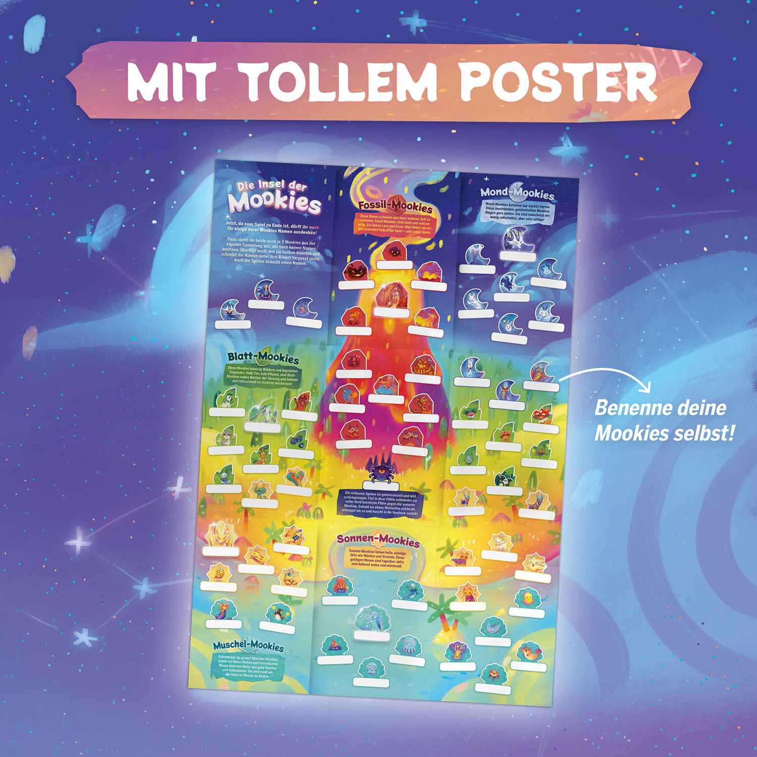 Auf der Insel der Mookies wartet ein tolles Sammel-Abenteuer! Zwei Kinder machen sich auf die Suche und begegnen zauberhaften Insel-Bewohnern - den Mookies. Immer abwechselnd wählen sie eine von zwei ausliegenden Karten und fügen sie der eigenen Sammlung hinzu. Wer am Ende des Spiels die meisten zusammenpassenden Symbole gesammelt hat, gewinnt wertvolle Trophäen. Doch Vorsicht: Die diebische Spinne wartet nur darauf, eine Trophäe zu stibitzen. Ein spannendes Sammelspiel für Kinder ab vier Jahren voller zauberhafter Illustrationen. Einige Karten haben Glitzereffekte, außerdem liegt ein großes Plakat mit allen Mookies bei.