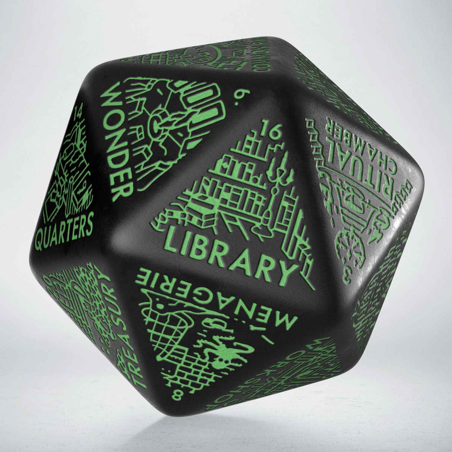 "No dungeon ready in your mind? Roll and explore! The Dungeon Generator Die is a jumbo-sized D20 designed by Viridian Dice - a perfect tool for Game Masters who love spontaneous worldbuilding. Each roll determines a unique chamber, adding structure and surprise toyour underground adventures. Available in two striking color variants: Beige & Black and Black & Green!"