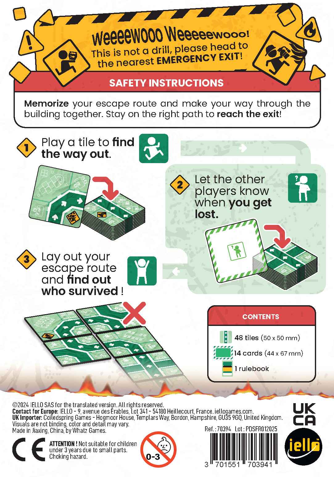 Play your “Lost tile” when you think you’re lost and the path is dead-end. At the end of the round, lay out your escape route and find out who survived to score points! Start a new round and add one more constraint to add even more panic to the table