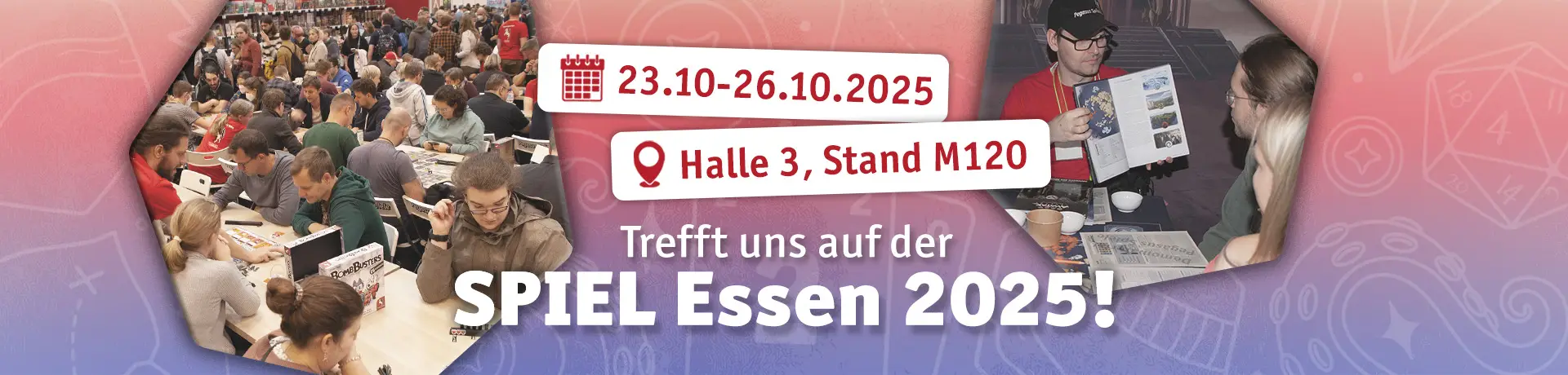 Die SPIEL in Essen ist für uns und sicherlich auch für die meisten von euch DAS jährliche Spiele-Highlight. Daher sind wir natürlich auch in diesem Jahr wieder vor Ort. Ihr findet uns in Halle 3 an Stand M120.