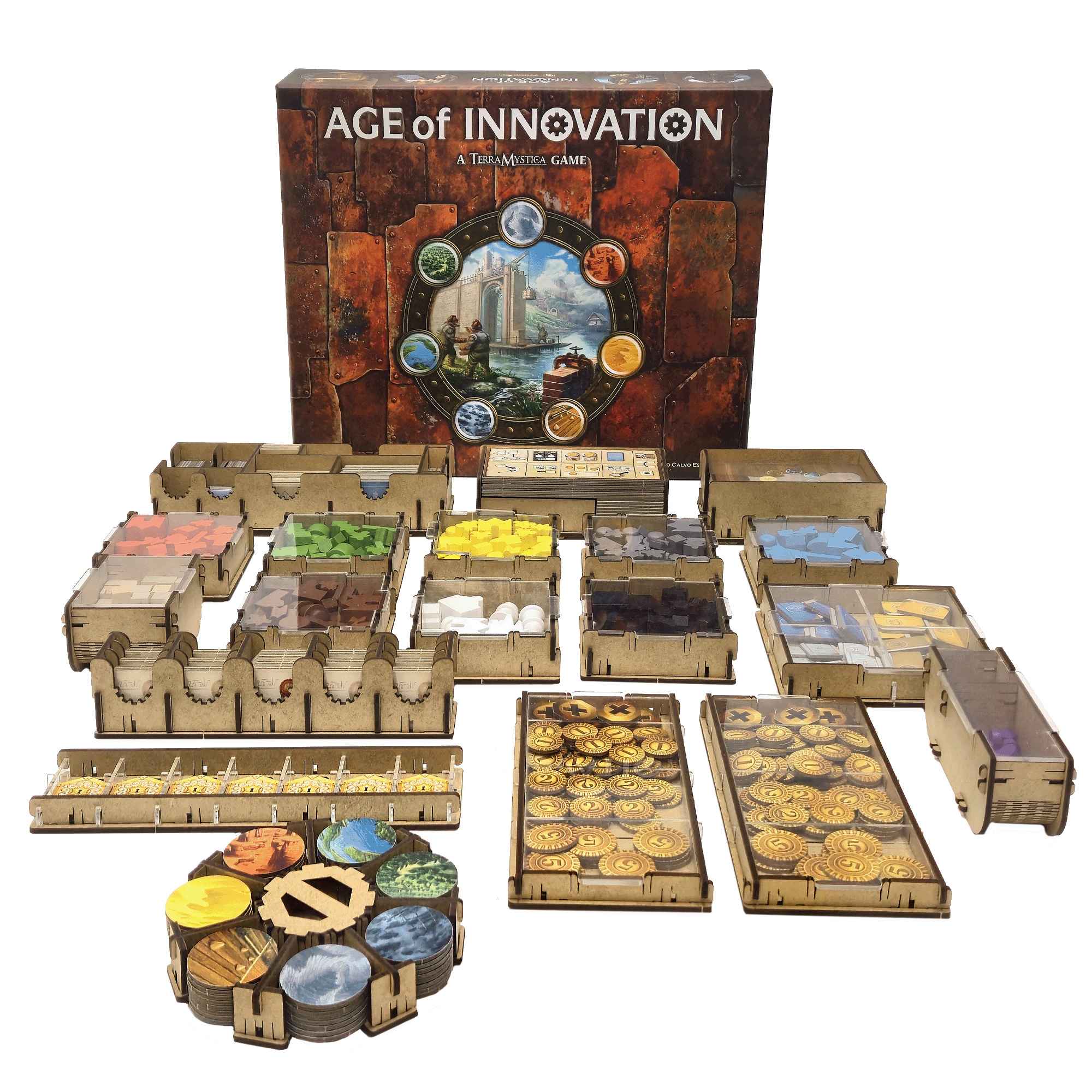 Our custom insert for Age of Innovation is designed to help you neatly organize all components and sleeved* cards, so everything stays in its place – no more clutter on the table or wasted time searching for pieces mid-game.