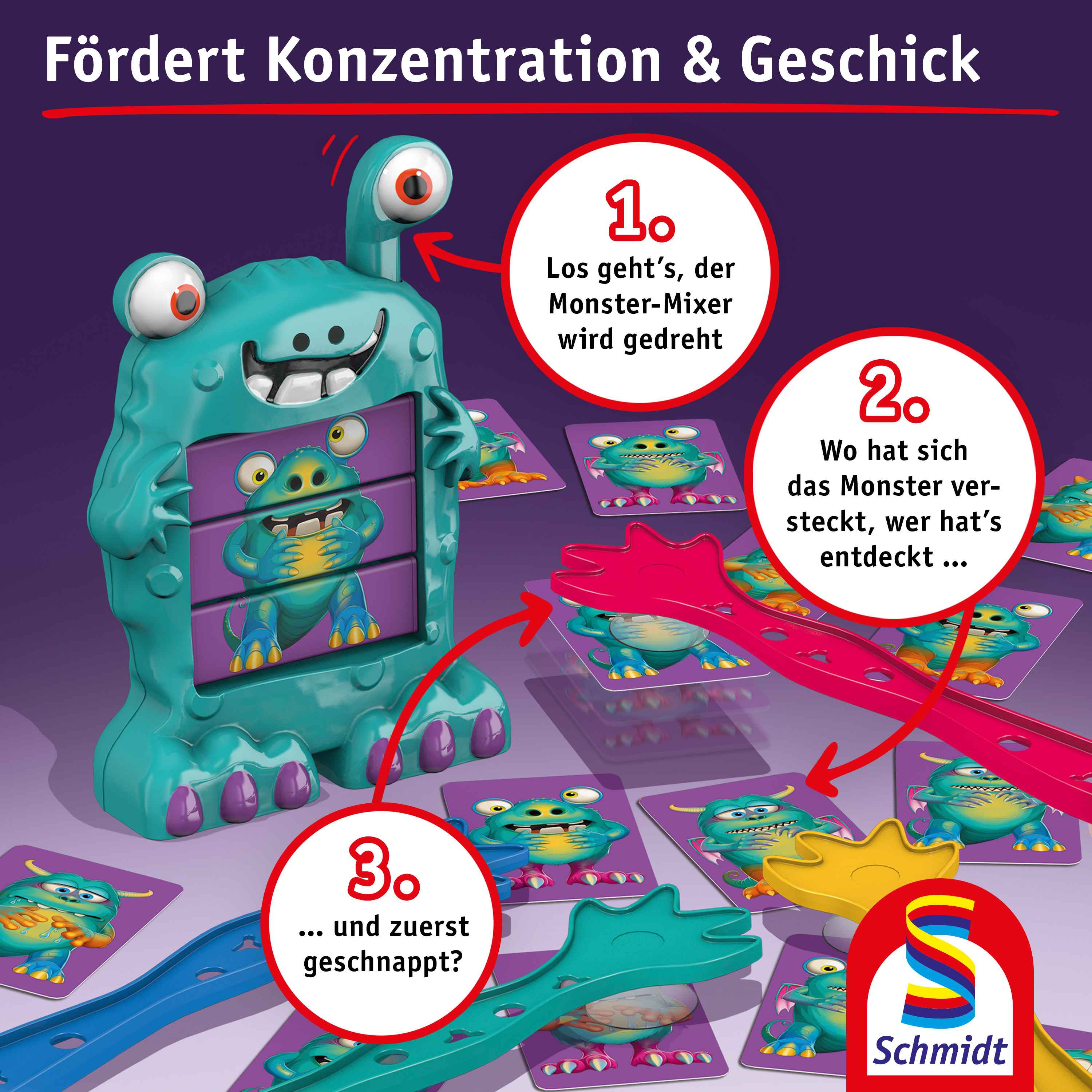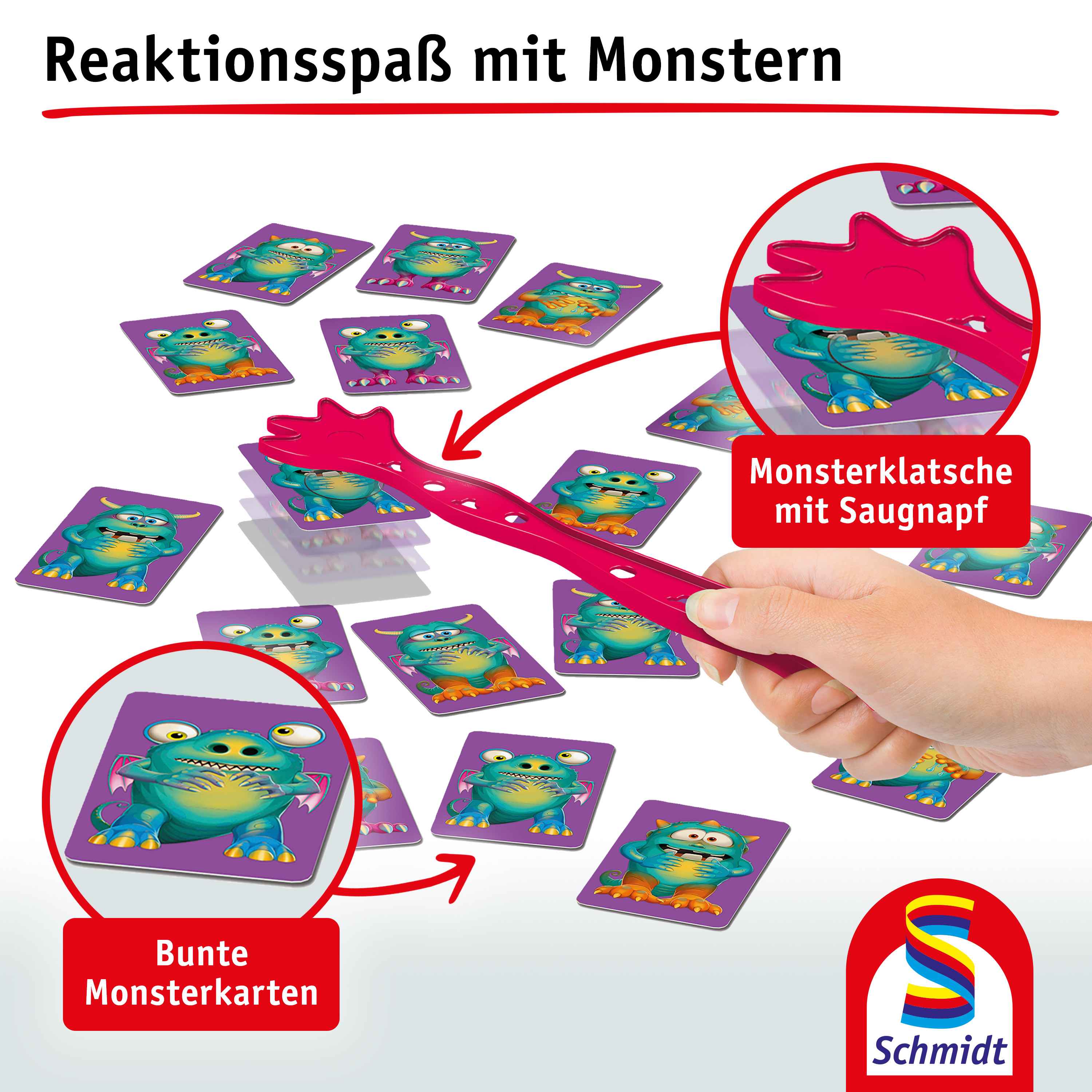 Bei diesem lustigen Reaktionsspiel bleibt kein Monsterauge trocken! Schlagt schnell mit euren Monsterklatschen auf das Monster, welches im Monster-Mixer angezeigt wird, und sichert euch eure Karte. Wer als Erster 5 Monster fängt, gewinnt die spaßige Monsterjagd!