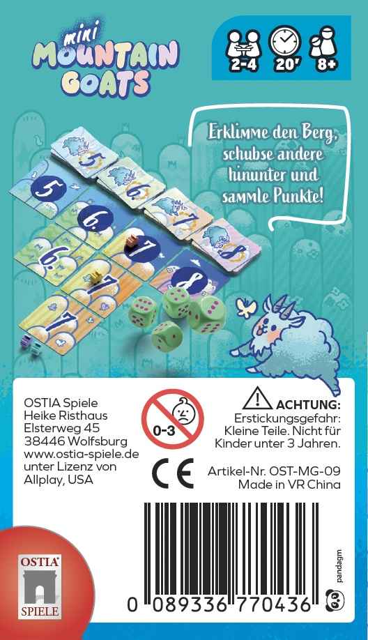 "Bei Mountain Goats bewegt ihr eure Ziegen mit 4 Würfeln Berge mit den Ziffern 5-10 hinauf. Jedes Ergebnis eines oder mehrerer Würfel bringt eure Ziege auf dem Berg mit der passenden Ziffer ein Feld dem Gipfel näher. Mehrere „1er“ bieten euch die Option, Würfel auf eine beliebige Zahl zu drehen. Wenig Regeln, aber viele Möglichkeiten!Auf dem Gipfel angekommen, gibt es eine Punkte-Karte als Belohnung. Für jedes weitere gleiche Würfelergebnis erntet eure Ziege auf dem Gipfel eine zusätzliche Punkte-Karte – bis die nächste Ziege sie zum Fuß des Bergs zurückschubst.Wer von jedem Gipfel eine Punkte-Karte sammelt, erhält Bonus-Punkte!Das beliebte Mountain Goats in noch kleinerer Schachtel und mit unendlich niedlichen Ziegen-Figuren! Dies Ziegen passen auch in die kleinste Handtasche!"