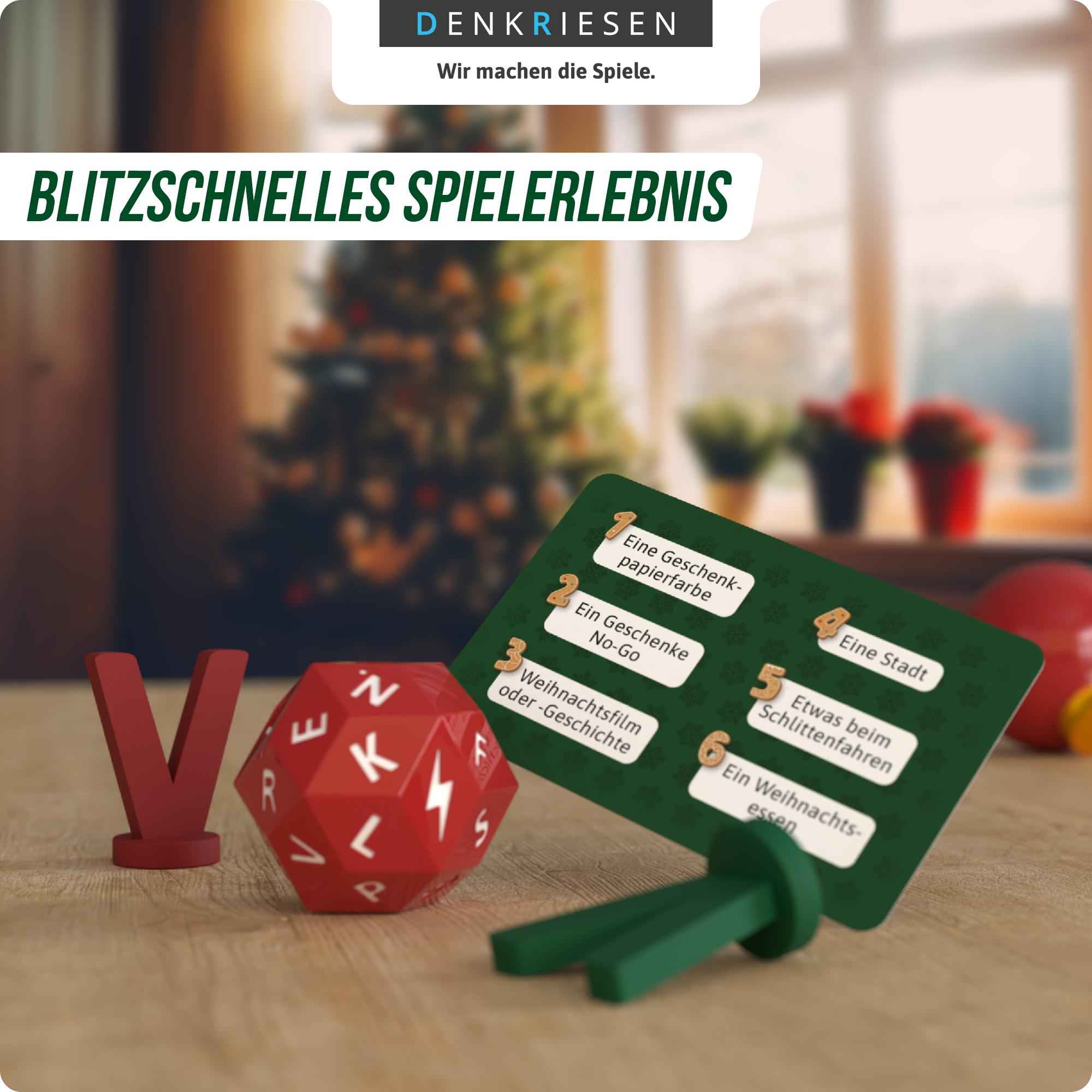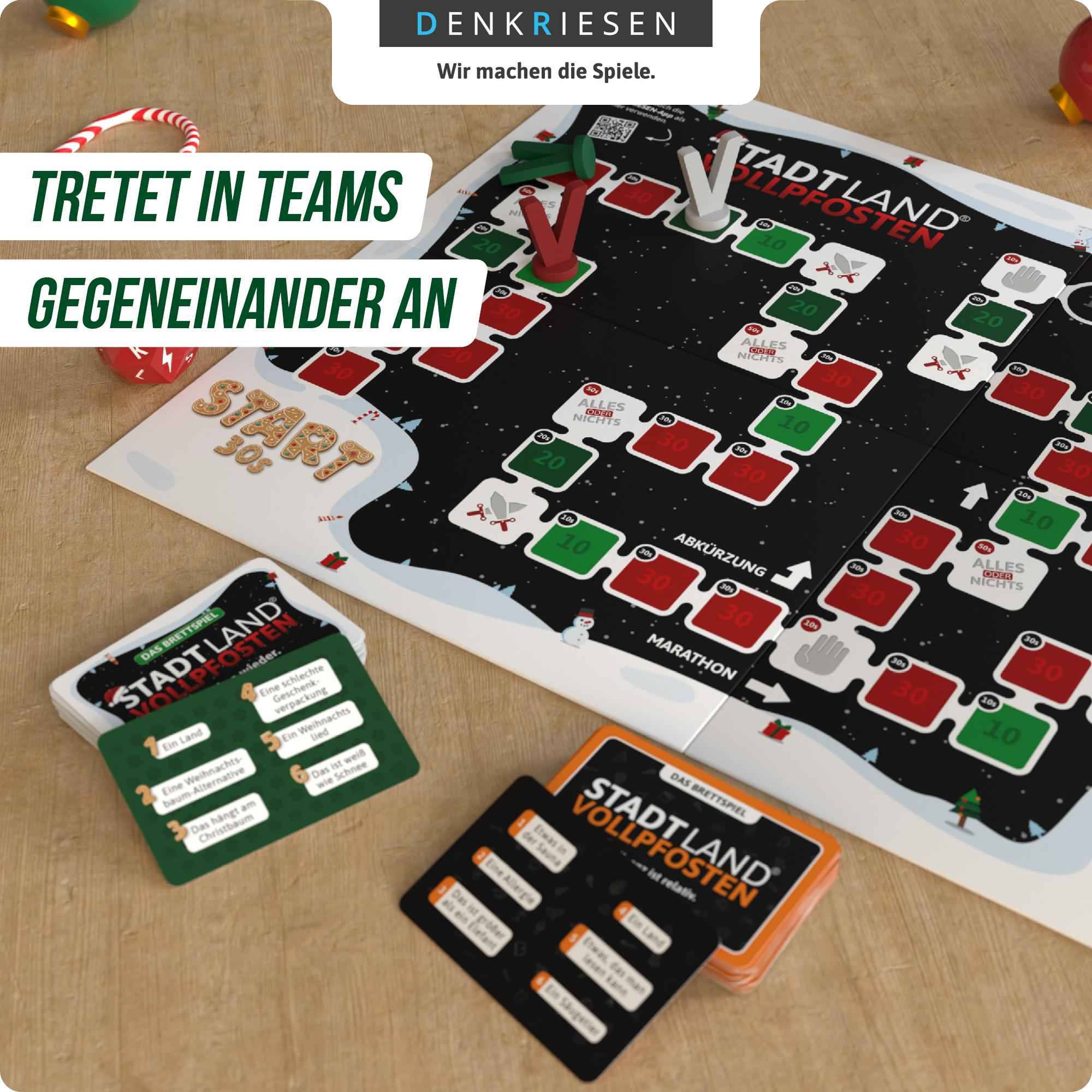 Erlebe das festliche STADT LAND VOLLPFOSTEN-Brettspiel für einen unvergesslichen Spieleabend mit Familie und Freunden. Über 700 witzige und kreative Kategorien bringen jede Weihnachtsrunde in Schwung. Tretet in Teams gegeneinander an und sammelt gemeinsam Punkte mit den richtigen Begriffen – wer denkt unter dem Tannenbaum am schnellsten? Doch Achtung! Die Zeit läuft und die verschiedenen Aktionsfelder fordern euch immer wieder heraus. Dank innovativem Buchstabenwürfel haben Schummler keine Chance. Spielspaß garantiert!