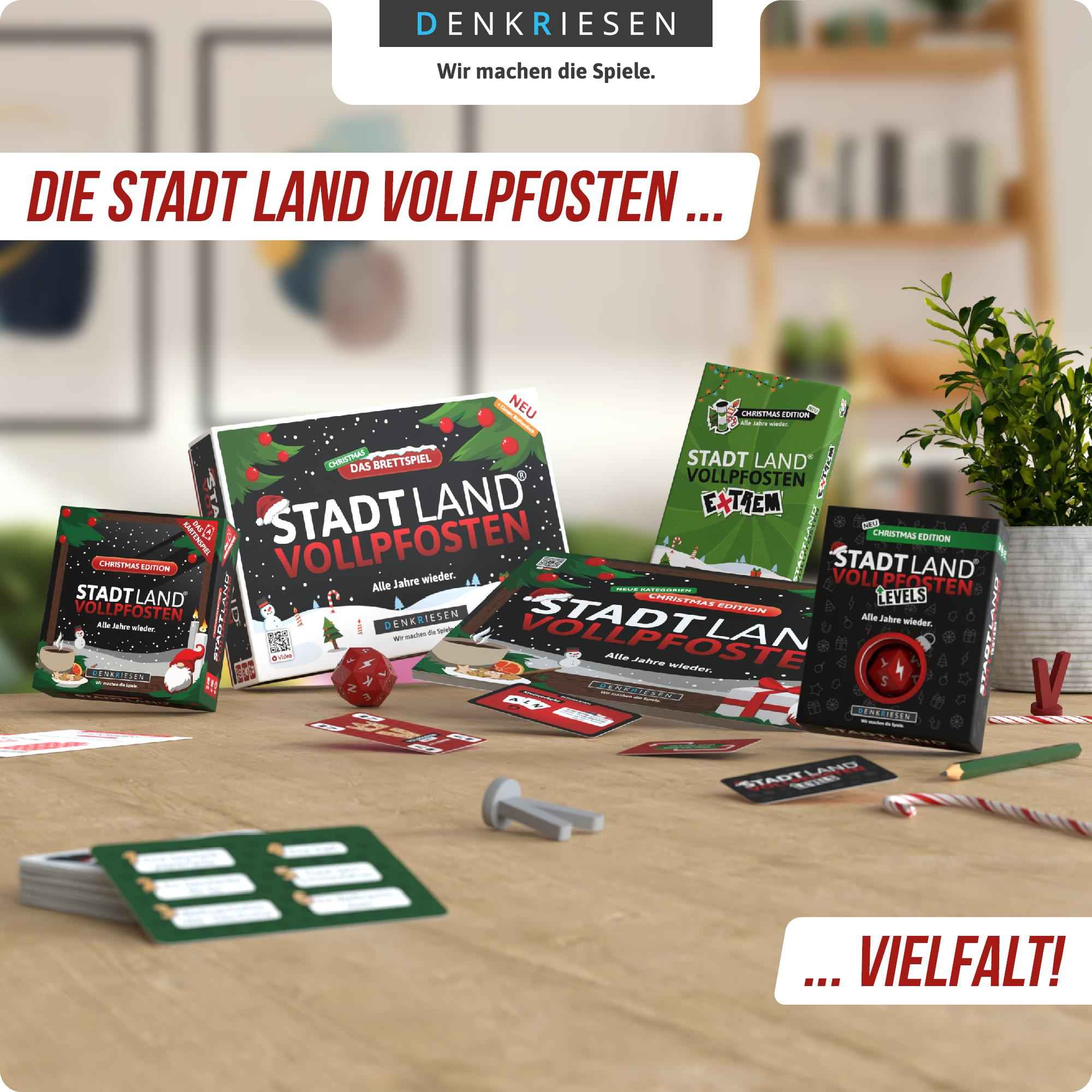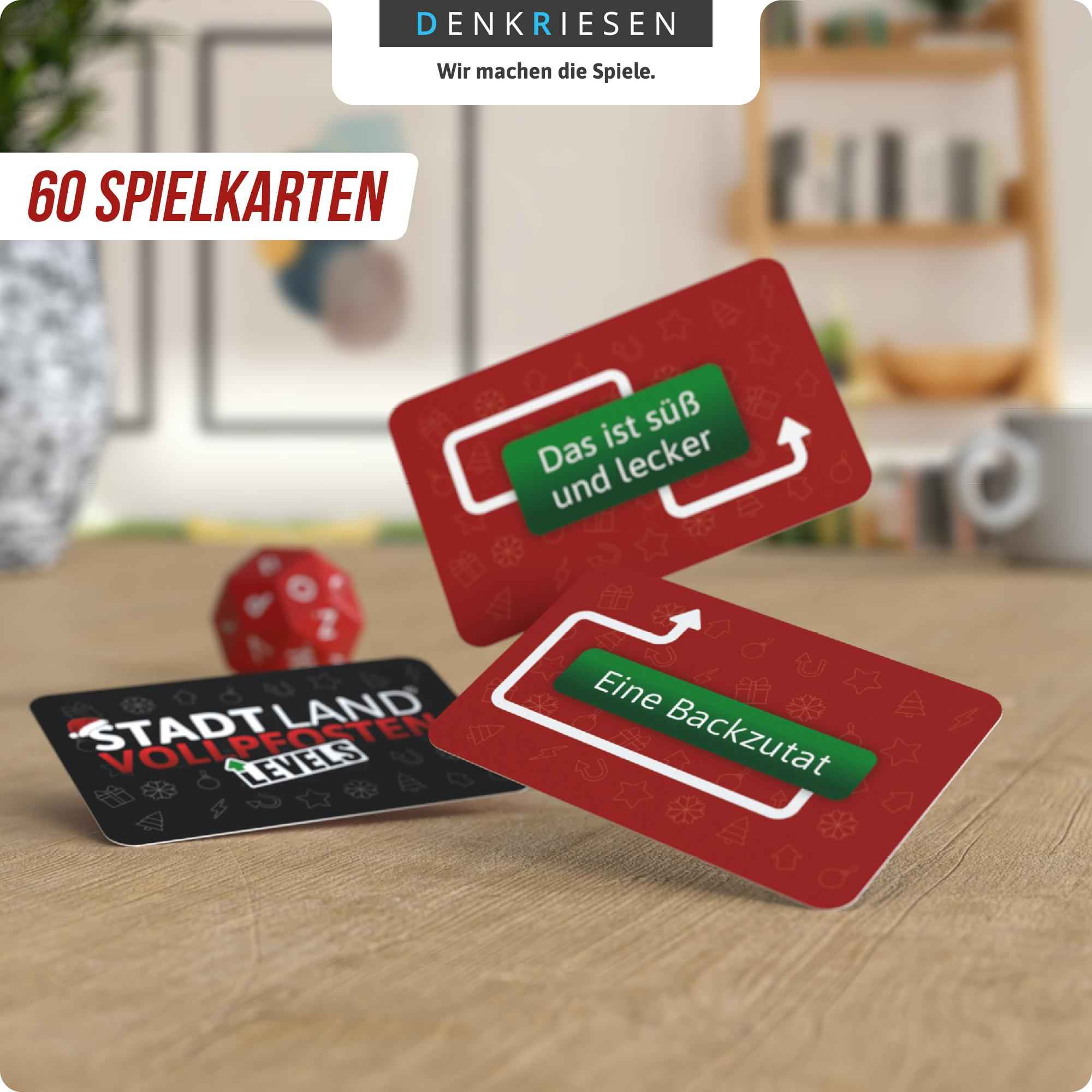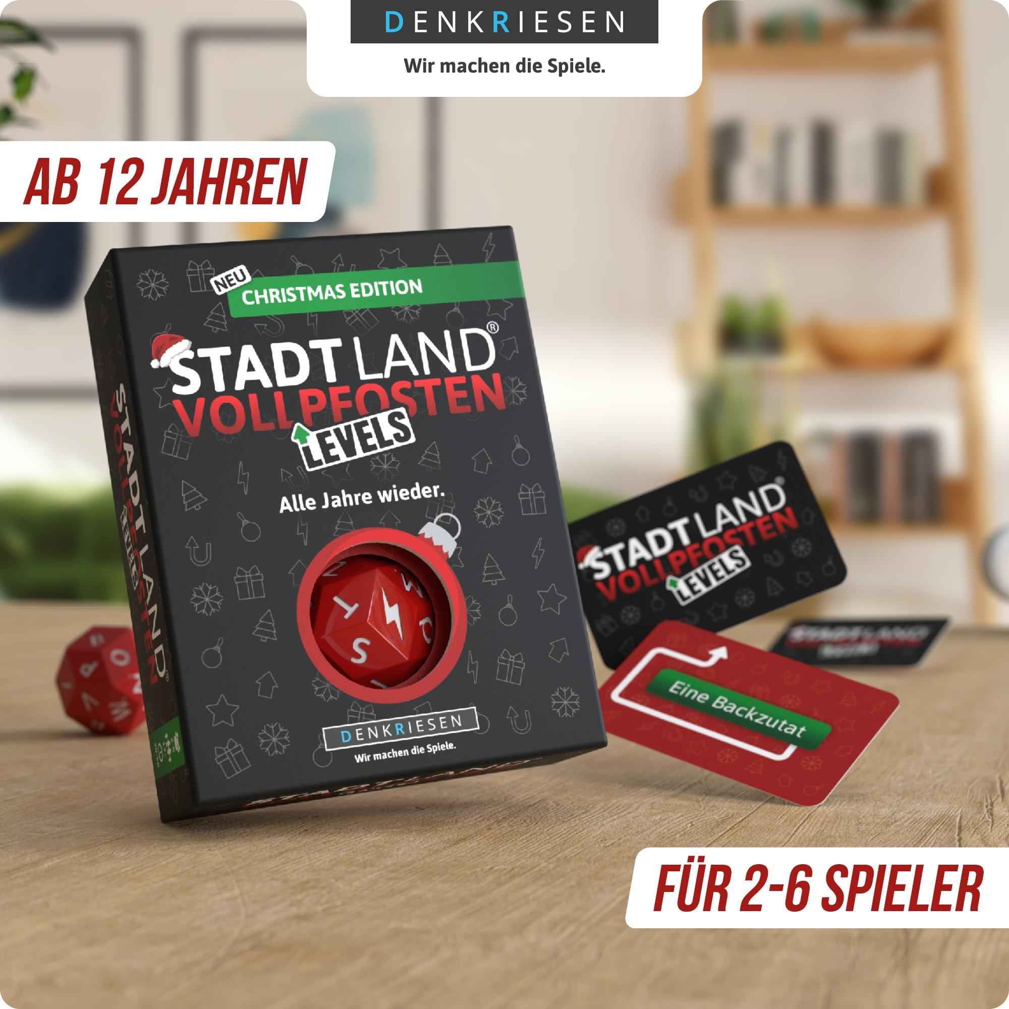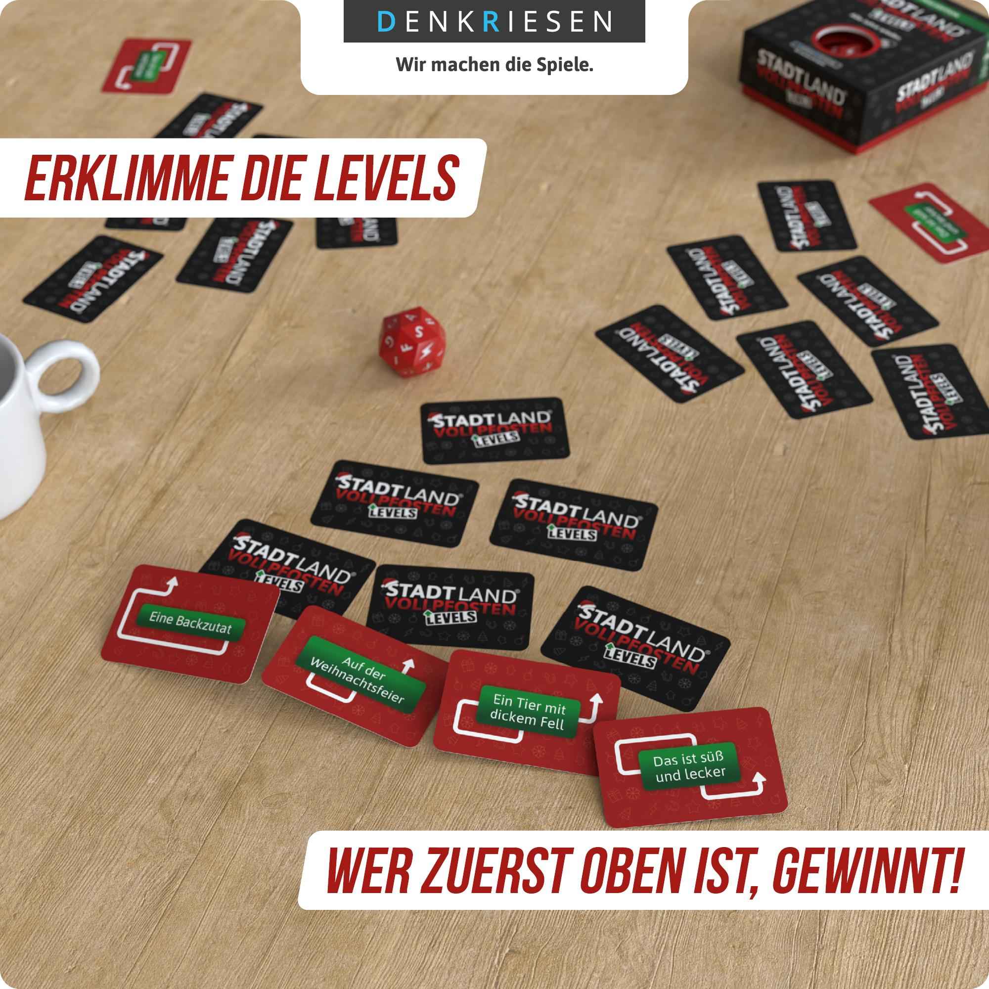 Bei dieser festlichen Variante von STADT LAND VOLLPFOSTEN geht’s hoch hinaus! Findet passende Begriffe zum gewürfelten Buchstaben und erklimmt so die Levels. Wer zuerst oben ist, gewinnt!