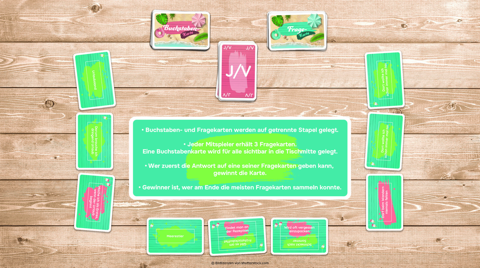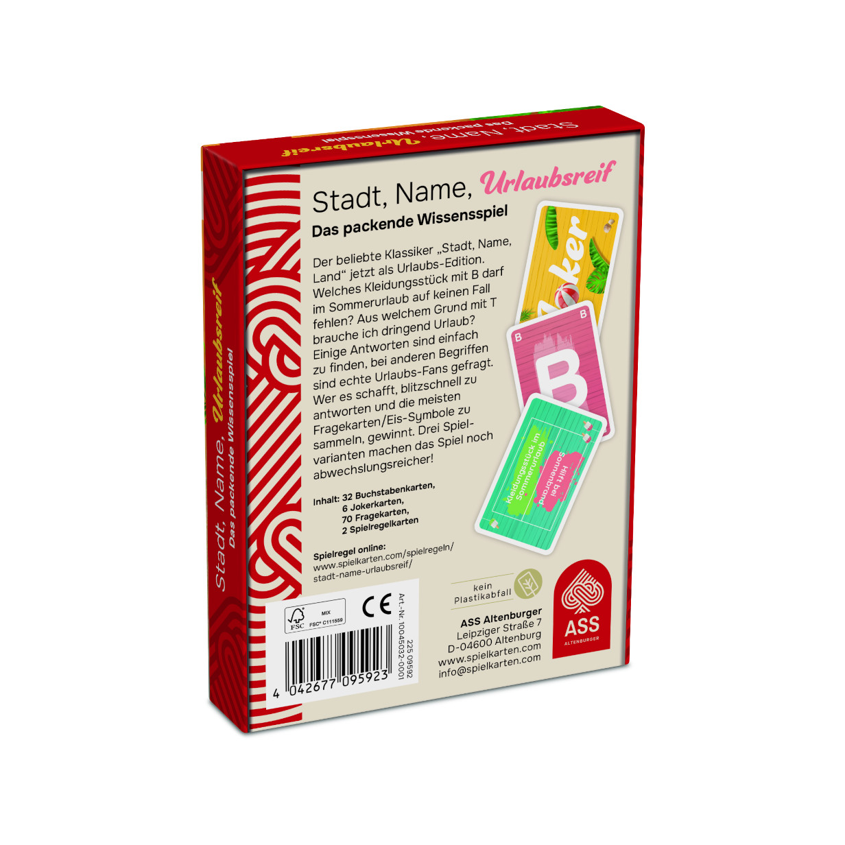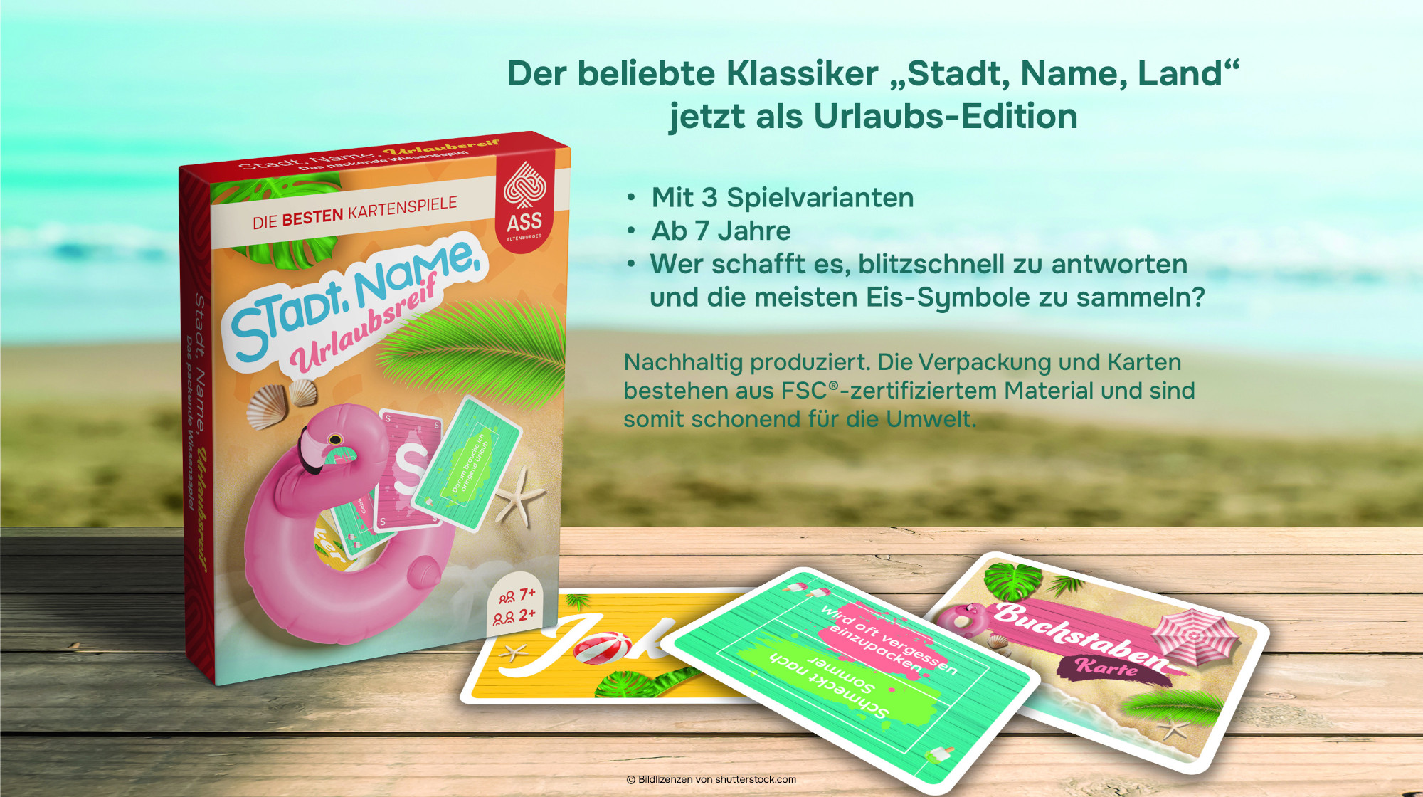 Der beliebte Klassiker „Stadt Name Land“ jetzt als Urlaubs-Edition. Welches Kleidungsstück mit B darf im Sommerurlaub auf keinen Fall fehlen? Welche Eissorte beginnt mit dem Buchstaben E? Aus welchem Grund mit T brauche ich dringend Urlaub? Einige Antworten sind einfach zu finden, bei anderen Begriffen sind echte Urlaub-Fans gefragt. Wer es schafft, blitzschnell zu antworten und die meisten Fragekarten / Eis-Symbole zu sammeln, gewinnt. Drei verschiedene Spielvarianten machen das Spiel noch spannender und abwechslungsreicher! Zudem kommt Stadt Name Urlaubsreif komplett ohne Plastik im Spiel aus. Die Karten sind statt in Plastik, mit Papier eingeschlagen und die Verpackung sowie die Karten bestehen aus FSC®-zertifiziertem Material und sind besonders schonend für die Umwelt.