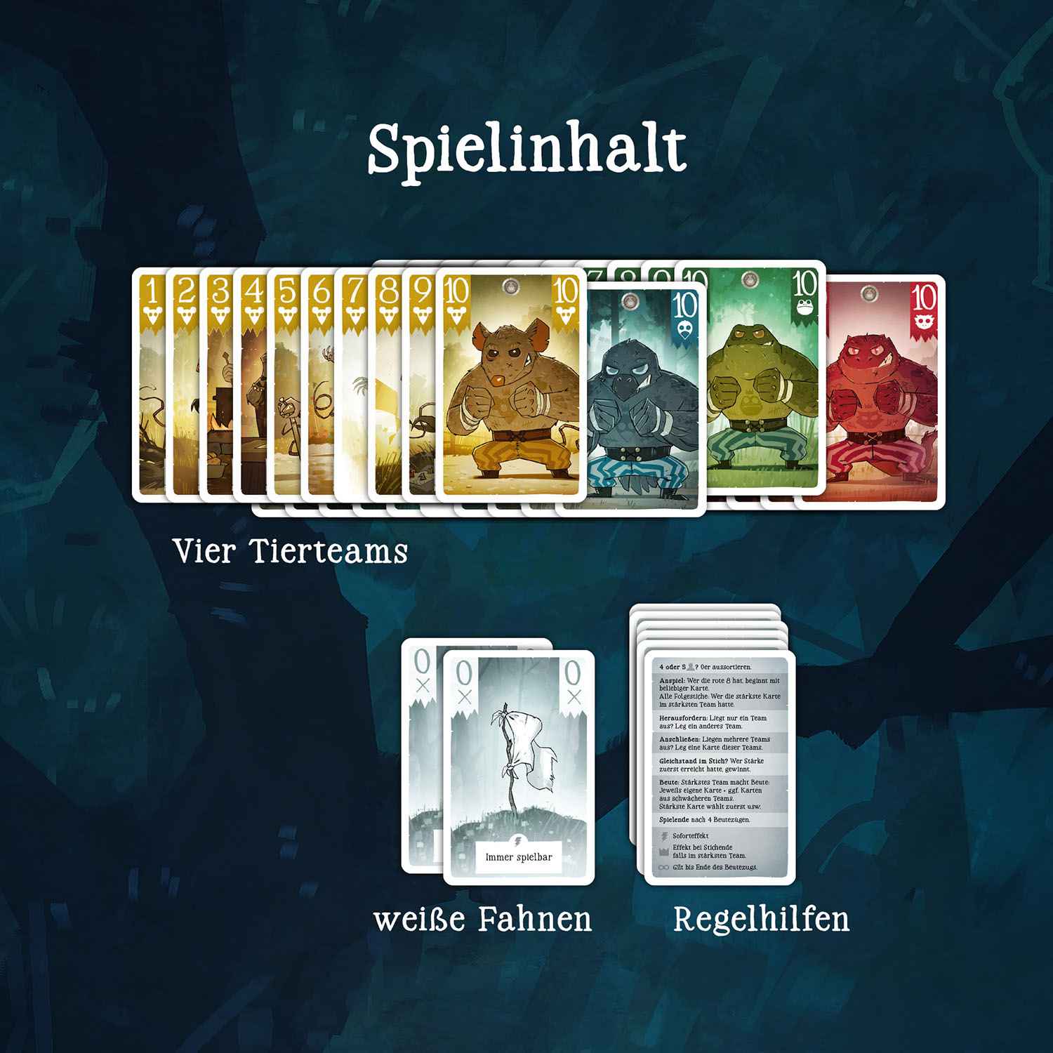 Maus-, Echse-, Fink- und Froschkarten liegen bereit, die Tierteams warten auf ihren Einsatz – doch wer gewinnt? In jeder Stichrunde entstehen neue Allianzen, und jede Entscheidung kann den Spielverlauf verändern. Vier witzig illustrierte Tierteams mit Zahlenwerten von 1 bis 10 bringen Atmosphäre auf den Tisch, während ihre Spezialfunktionen für unerwartete Wendungen sorgen. Wer clever spielt und im Gewinnerteam landet, sammelt Punkte, bis die Zielzahl erreicht ist. Flinke Runden halten die Spannung hoch und machen das Spiel zu einem unterhaltsamen Erlebnis für Familien, Freundeskreise und alle, die Teamgeist mit ein wenig Strategie verbinden möchten.