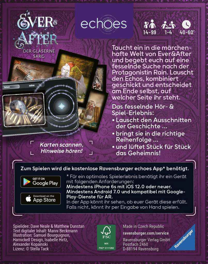 echoes ist ein einzigartiges, kooperatives Audio Mystery Spiel. Die Spieler hören mithilfe der kostenlosen Ravensburger echoes App mysteriöse Geräusche und Stimmen, die mit den Kartenmotiven verbunden sind. Gemeinsam bringen sie die 24 Teile der Geschichte in die richtige Reihenfolge.
