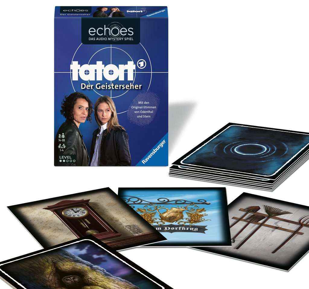 Tatort in der Pfalz: Bauer Feldmann wurde ermordet. Die Spieler ermitteln gemeinsam mit Lena Odenthal und Johanna Stern. echoes ist ein kooperatives Audio Mystery Spiel. Die Spieler hören mithilfe der kostenlosen Ravensburger echoes App mysteriöse Geräusche und Stimmen, die mit den Kartenmotiven verbunden sind. Gemeinsam bringen sie die 24 Teile der Geschichte in die richtige Reihenfolge, um den Fall zu lösen.