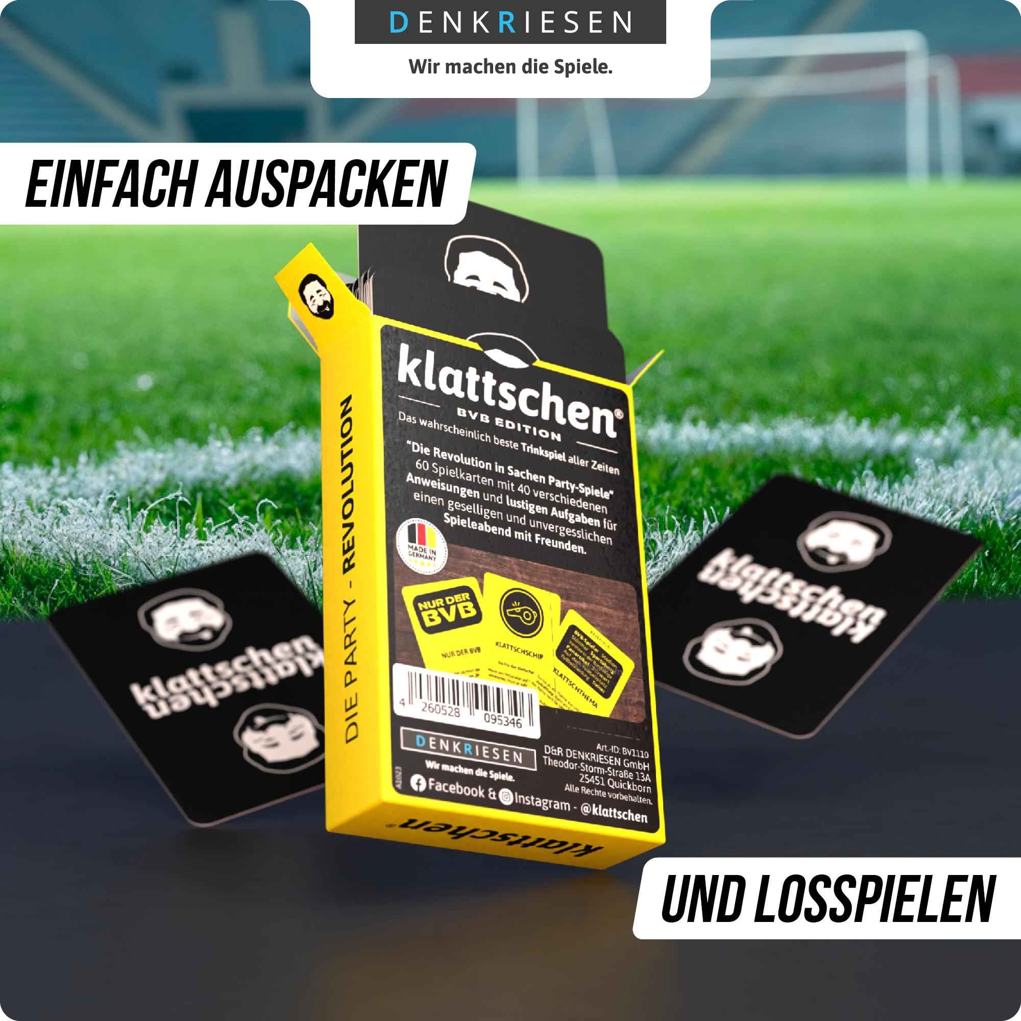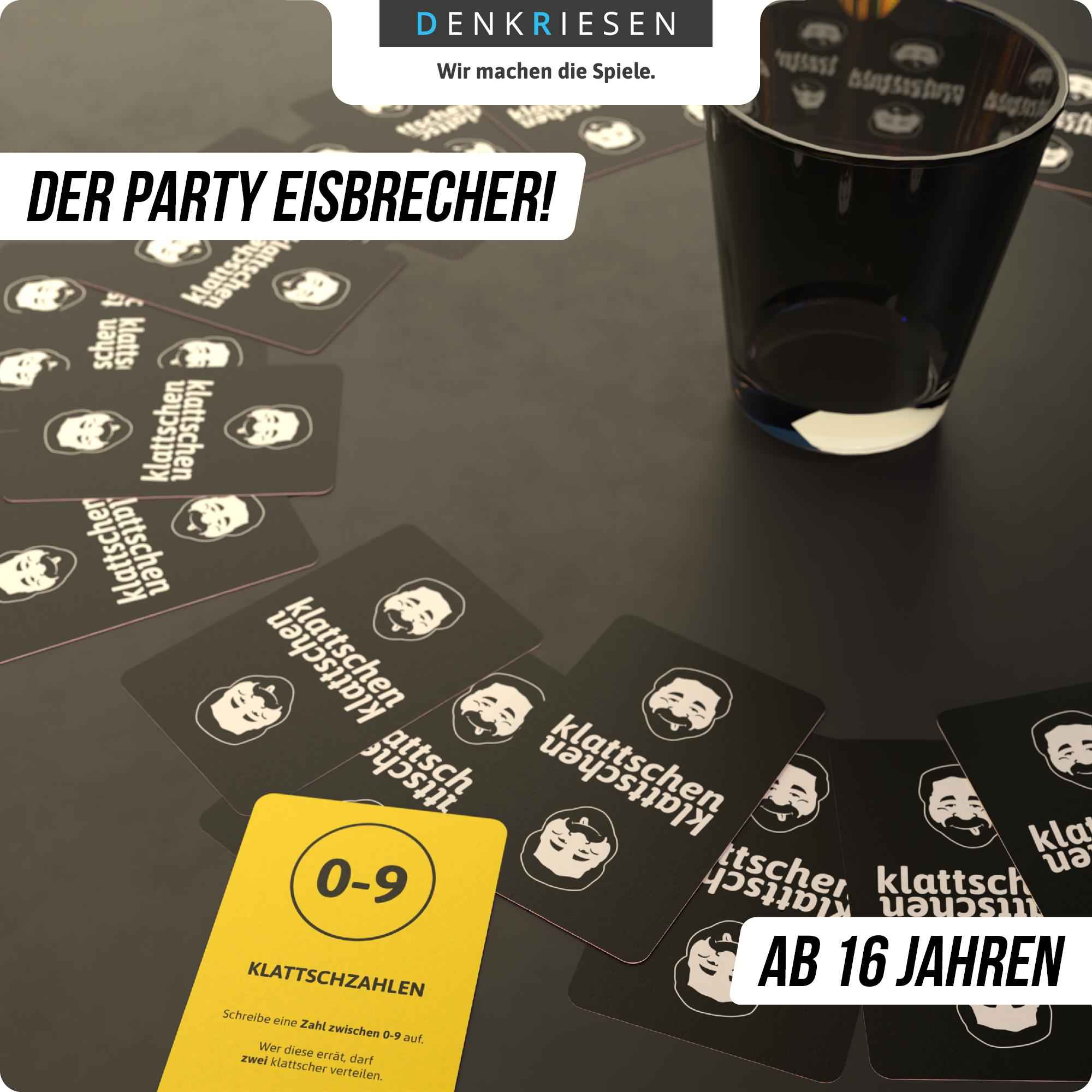 Langweilige Party in Sicht? Nicht mit diesem Spiel! Mit dem Kult-Trinkspiel klattschen der Marke DENKRIESEN hast du das perfekte Spiel um einen feucht-fröhlichen Abend mit deinen Freunden zu erleben. klattschen ist das meistverkaufte Karten-Trinkspiel Deutschlands und besteht aus 60 Spielkarten mit 40 verschiedenen Aufgaben und Anweisungen. Wer sich nicht an die Anweisungen hält oder einen Fehler bei der Ausführung macht, muss trinken (im Spiel „klattschen“ genannt). Außerdem müssen sich alle Spieler während des gesamten Spiels an die 3 Grundregeln halten.